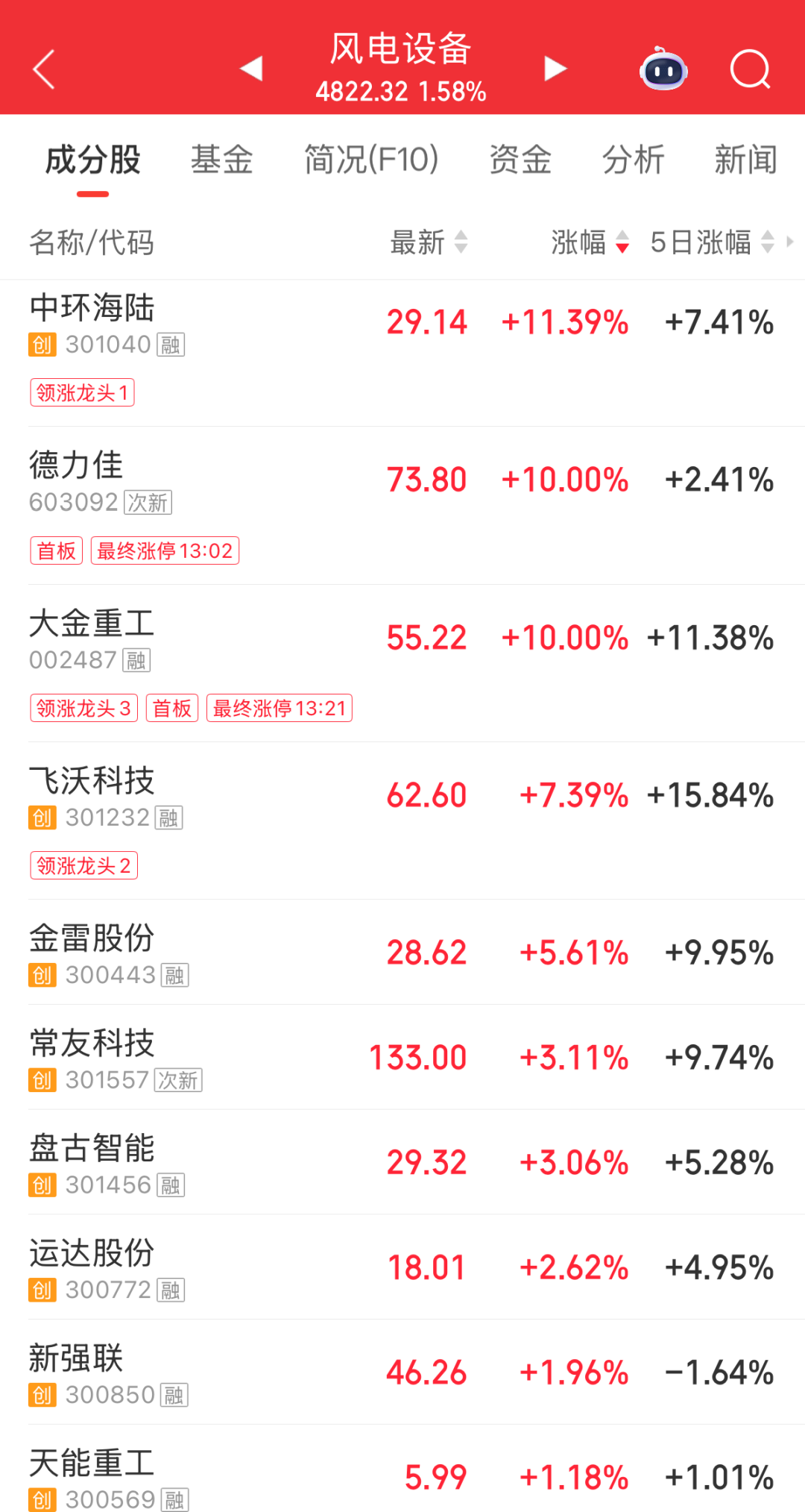 今日,风电设备板块震荡上涨。大金重工、德力佳涨停,中环海陆涨超11%,飞沃科技、金雷股份等跟涨。