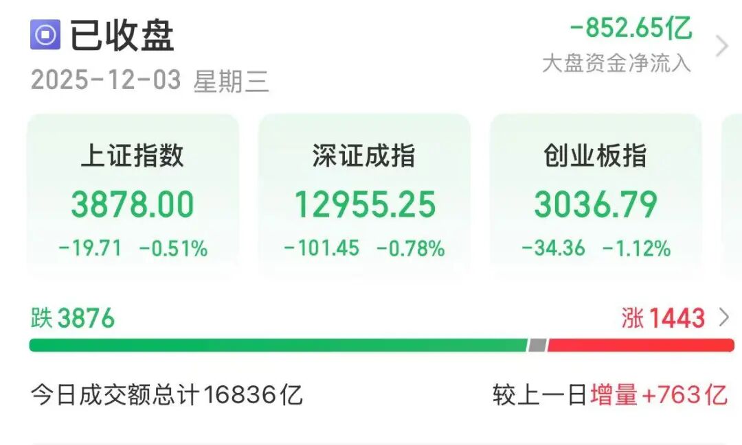 12月3日,A股震荡调整。截至收盘,上证指数跌0.51%,深证成指跌0.78%,创业板指跌1.12%。全市场成交额16836亿元,较上一交易日增加763亿元。