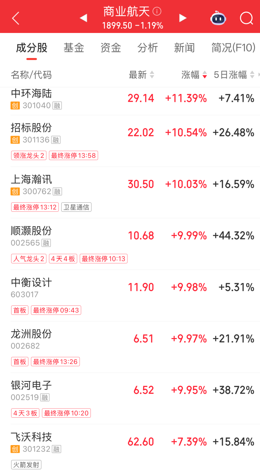 今日,商业航天概念股表现活跃,龙洲股份、银河电子等涨停。午后,上海瀚讯直线拉升,一度触及“20CM”涨停,截至收盘上涨10.03%。