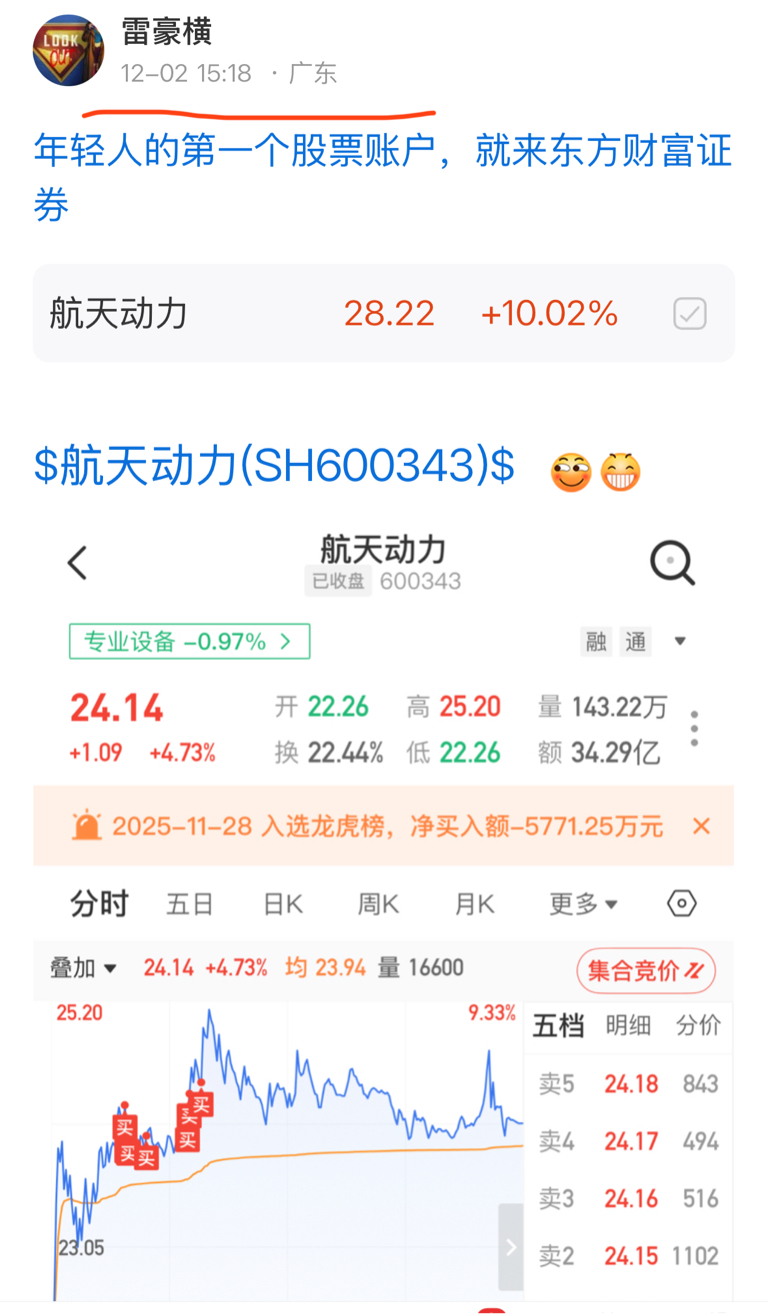 我今天没发航天动力,是因为昨天卖了半仓,今天涨停全部卖了!今天拿下的第5个涨停!