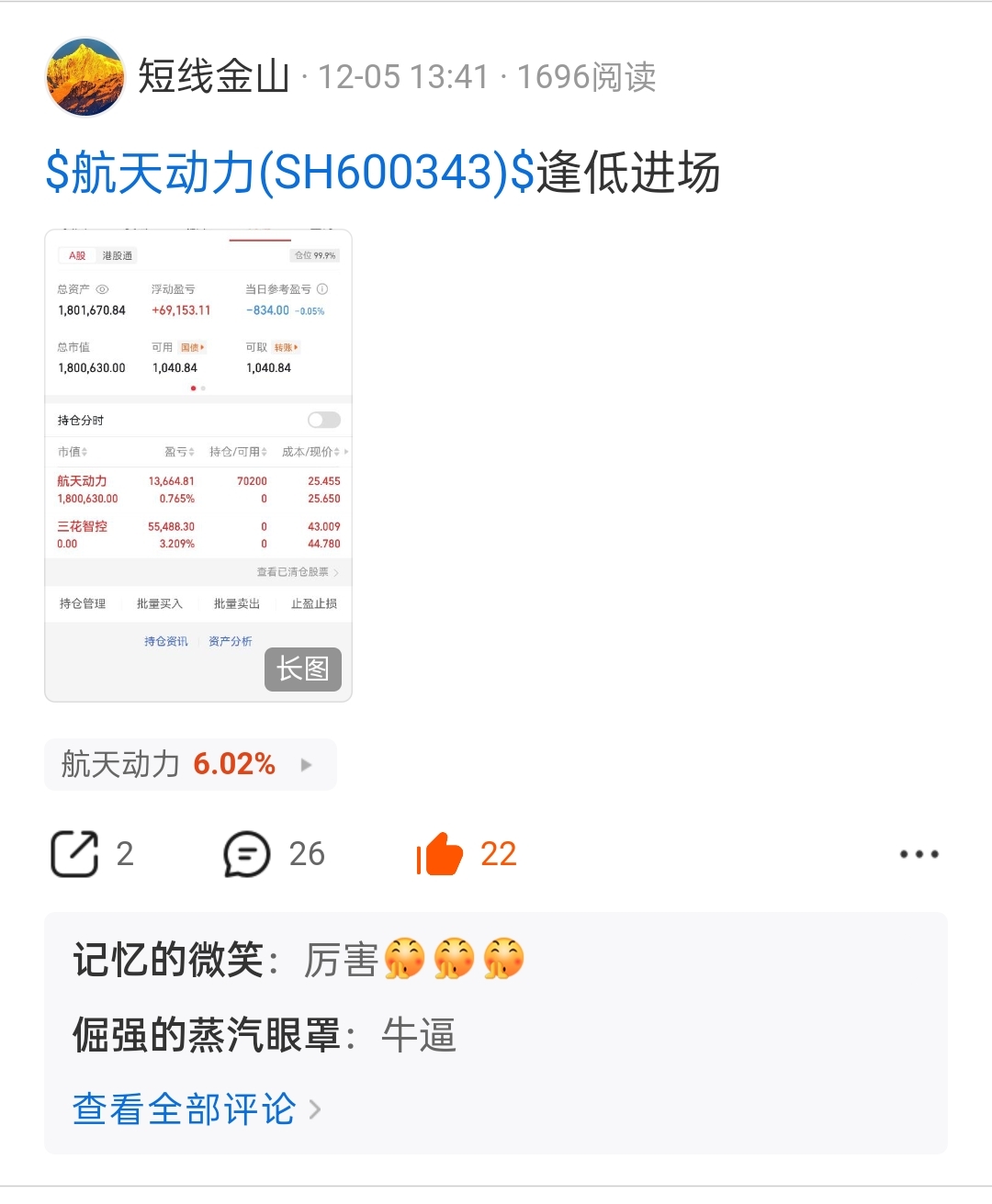 $航天动力(SH600343)$ 兄弟姐妹们早上好,老规矩,先点赞关注报道支持。新的一周开始了,竞价结束,今天又是稳稳的幸福,大口吃肉了。