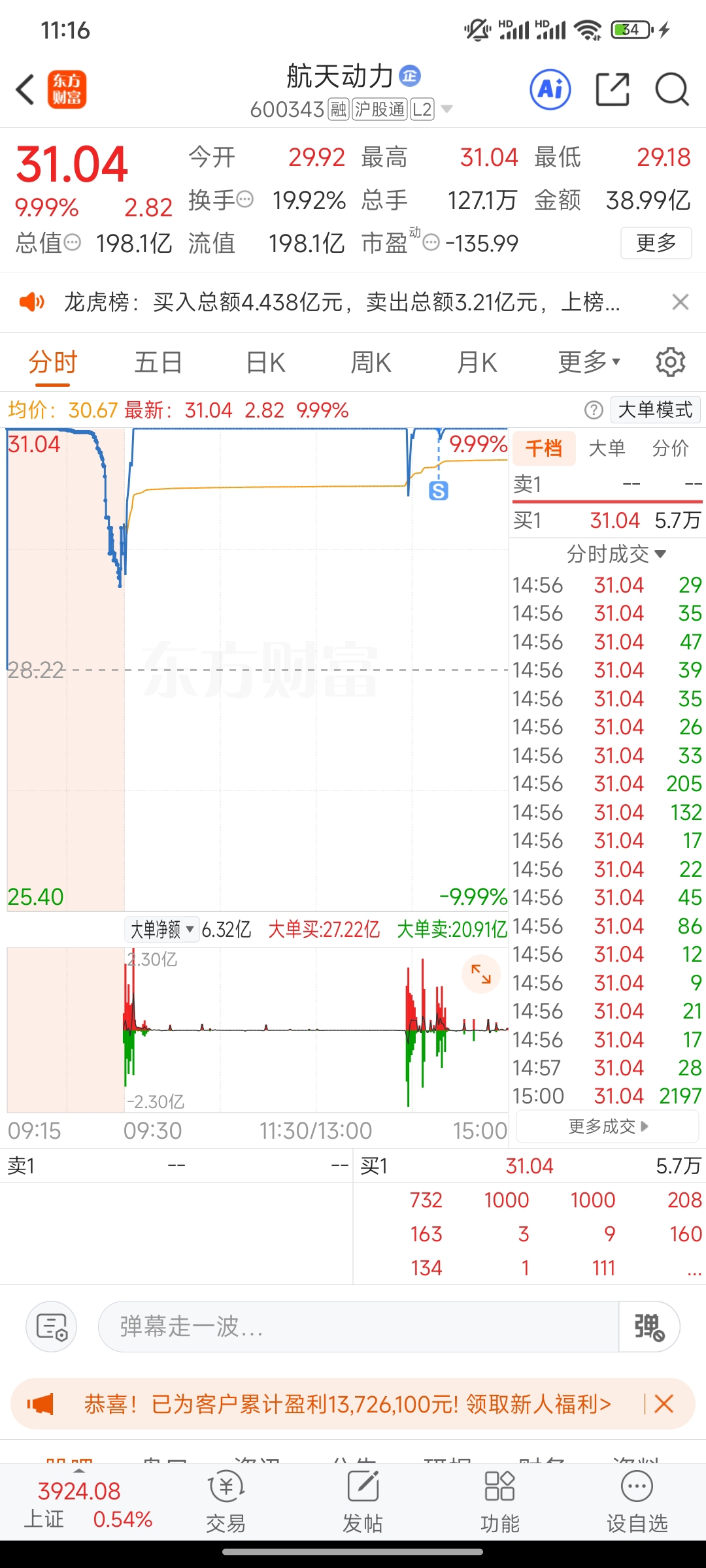 $航天动力(SH600343)$ 卖飞没,全仓啊