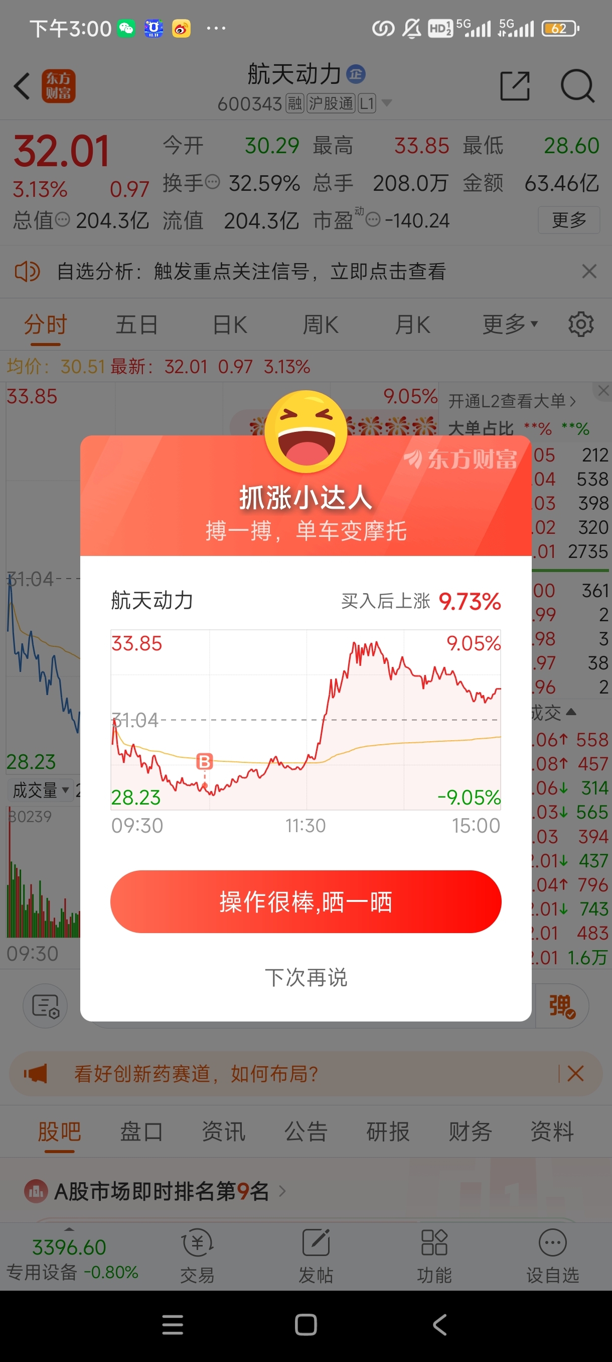 $航天动力(SH600343)$ $通威股份(SH600438)$ 今天不知道该笑还是该哭,昨天全仓卖了鸿博,今天鸿博涨停,昨天全仓通威今天水下割了大半仓通威,然后把大半仓位进了航天动力,结果通威涨了五个点,航天吃了一个涨停,希望明天航天动力高开涨停,看的出上涨中继
