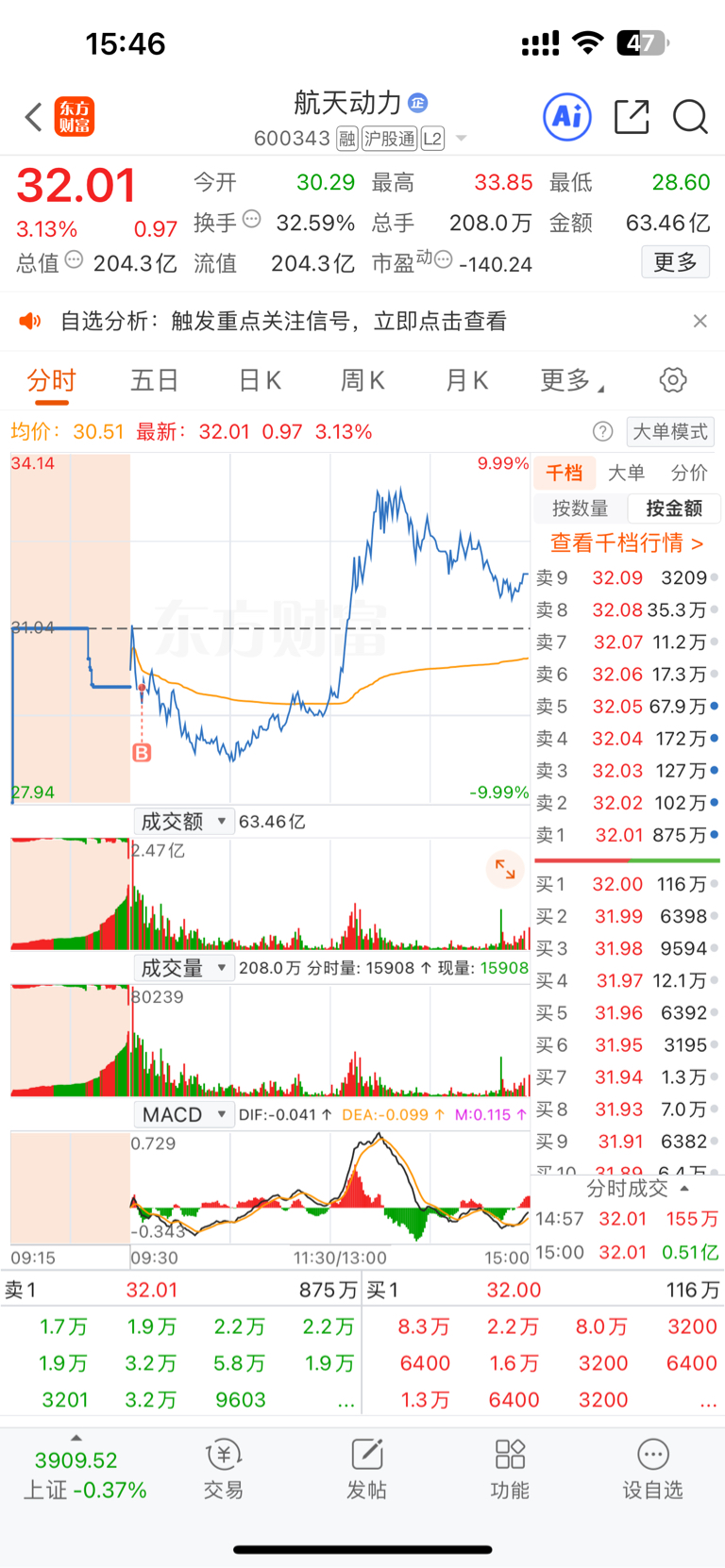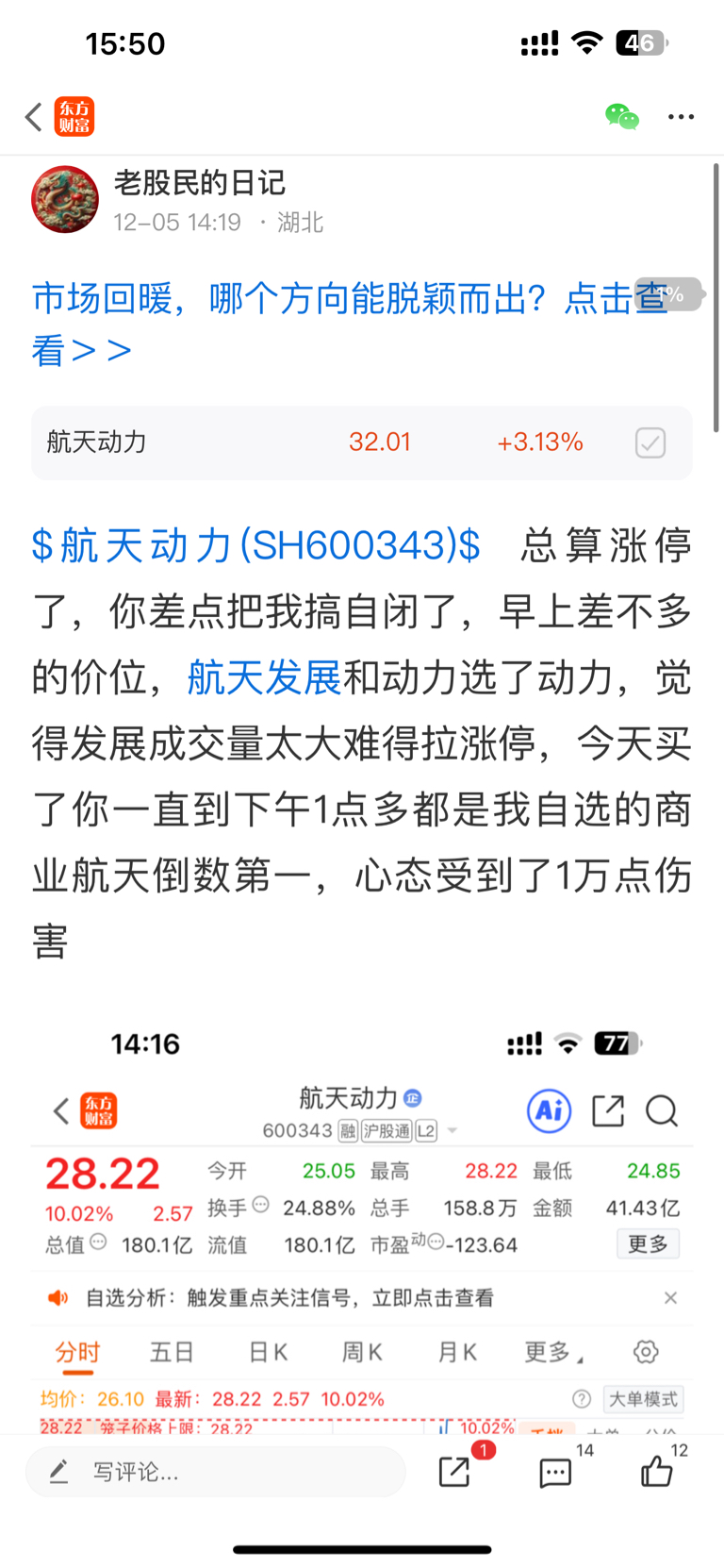 $航天动力(SH600343)$ 每当商业航天板块摇摆不定,没有方向的时候航天动力就会主动站出来提供动力,12.3号如此,今天亦如此,周五水下进昨天下午炸板卖了收获21个点,今天-3.8抄底差点被埋,然后又是全天在商业航天板块垫底下午反败为胜的故事,体验感挺爽,不搞龙头航天发展了,航天板块后面不倒就反复