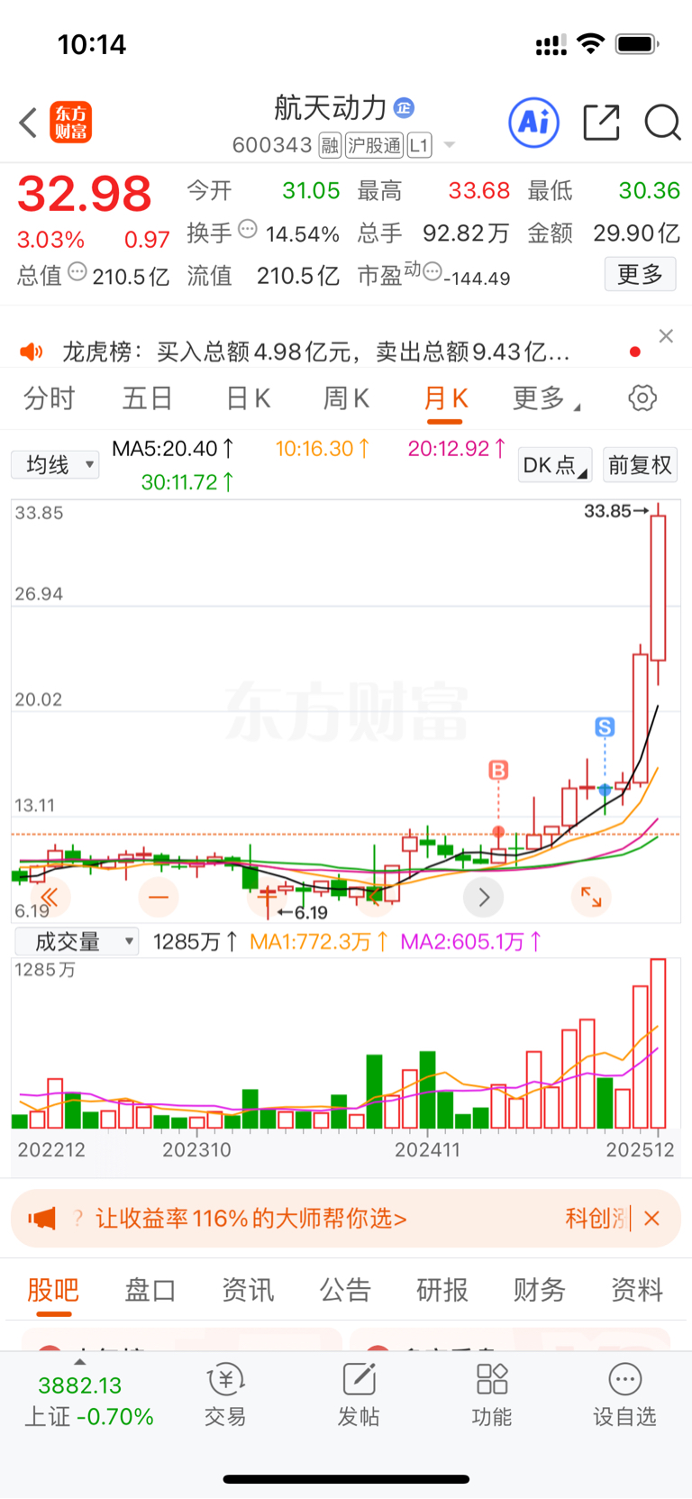 $航天动力(SH600343)$ 每天都活在你上涨的恐惧中