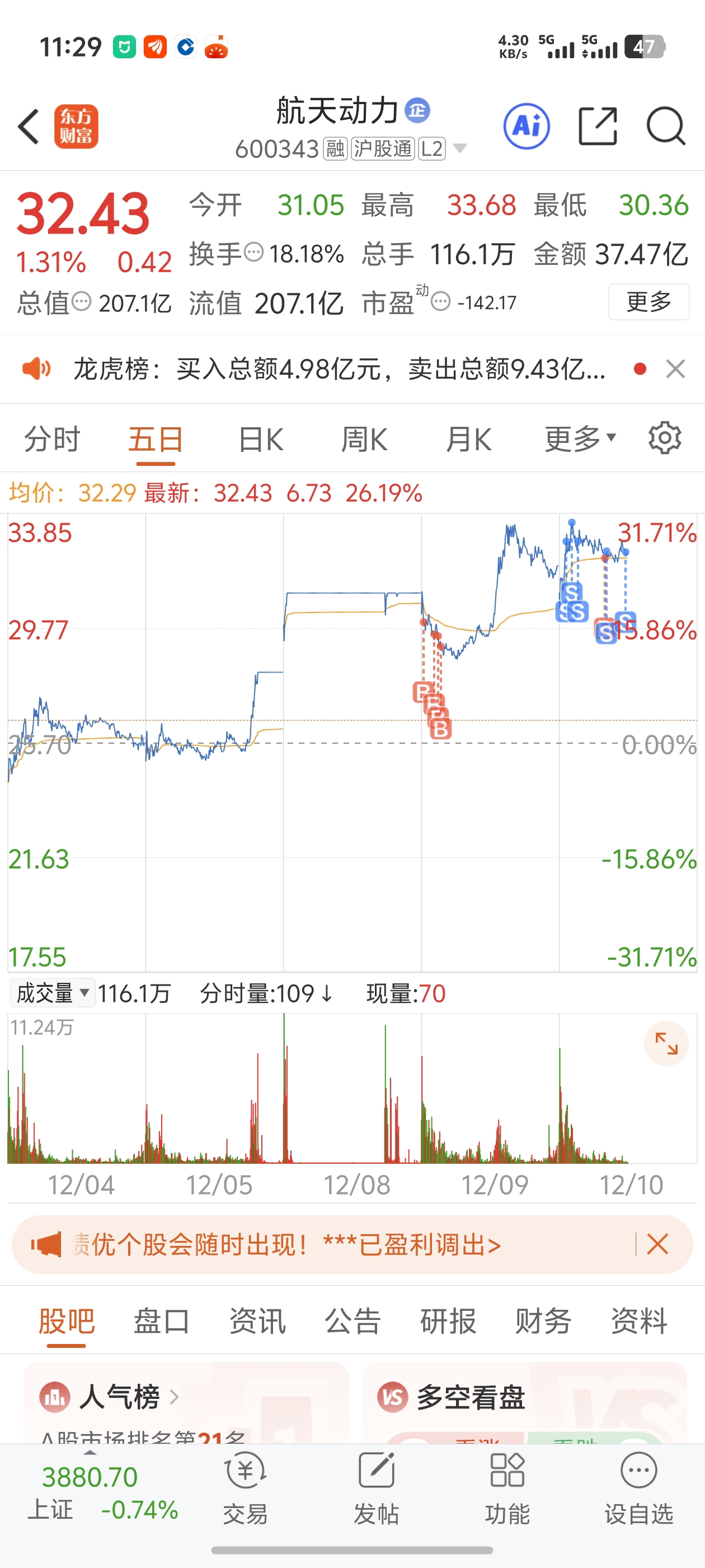 $航天动力(SH600343)$ 早知道最高点全跑了,还留一半