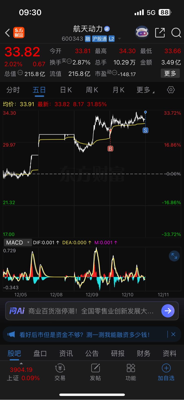 $航天动力(SH600343)$ 超短的每一步操作都要预见 34.1今日早盘最高出货价