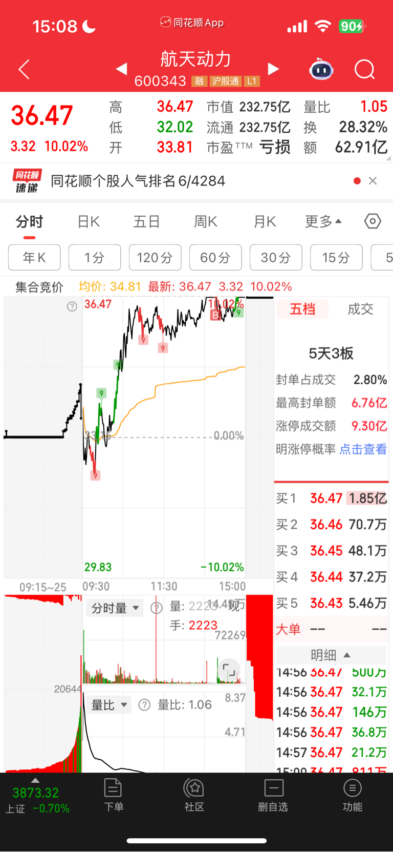 $航天动力(SH600343)$ 忍了一天,尾盘架不住明天商业航天有火箭发射利好诱惑,提前拿个先手哈哈