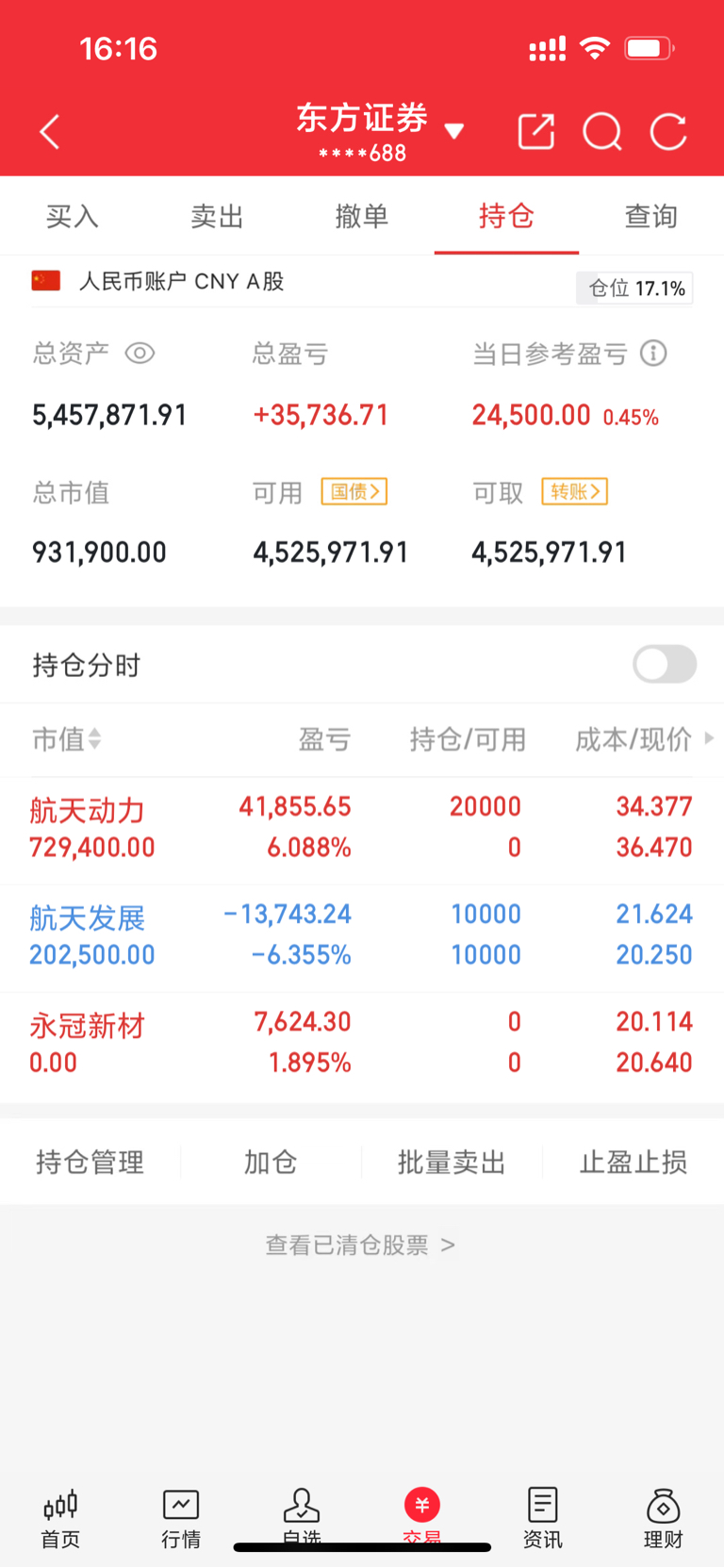 今日买进$航天动力(SH600343)$ 继续持有$航天发展(SZ000547)$ 卖出$永冠新材(SH603681)$