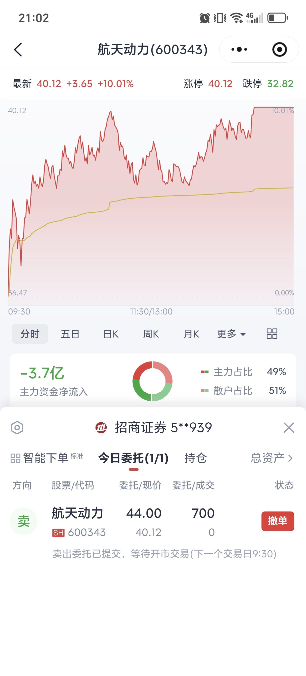 $航天动力(SH600343)$ 以挂单,周一走人,周一我看多看航天板块持续高涨但周二我不看好所以提前挂单了,说说我不看好周二的原因,周一如果动力再升这两涨停那周二再涨就双双进严重异动这种情况下周二资金肯定不敢硬顶这两个情绪标如果出现滞胀那肯定会是大分歧的,现在板块核心就是动力顺灏再升这三哥们两个滞胀那情绪肯定不好。