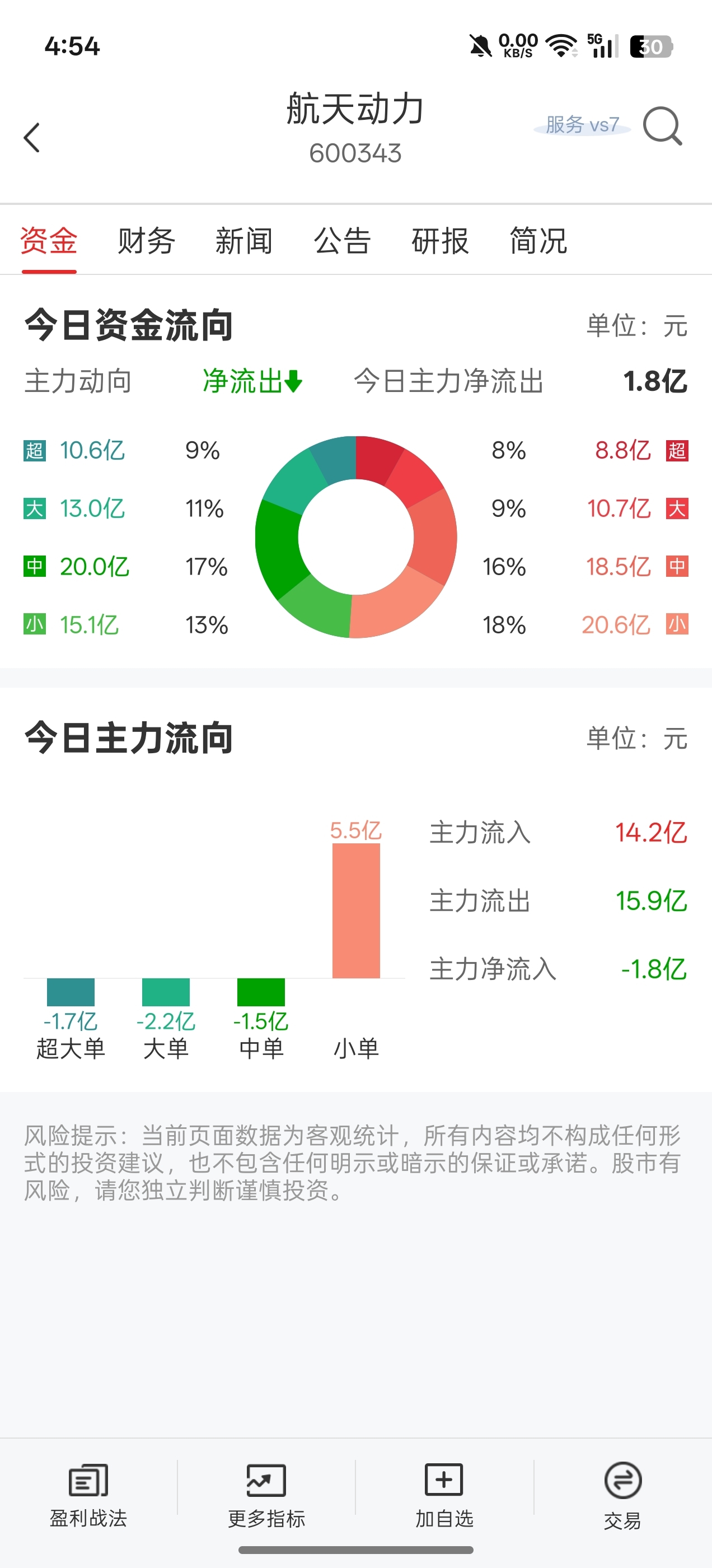 $航天动力(SH600343)$ 了,主力今天流出1.8个亿