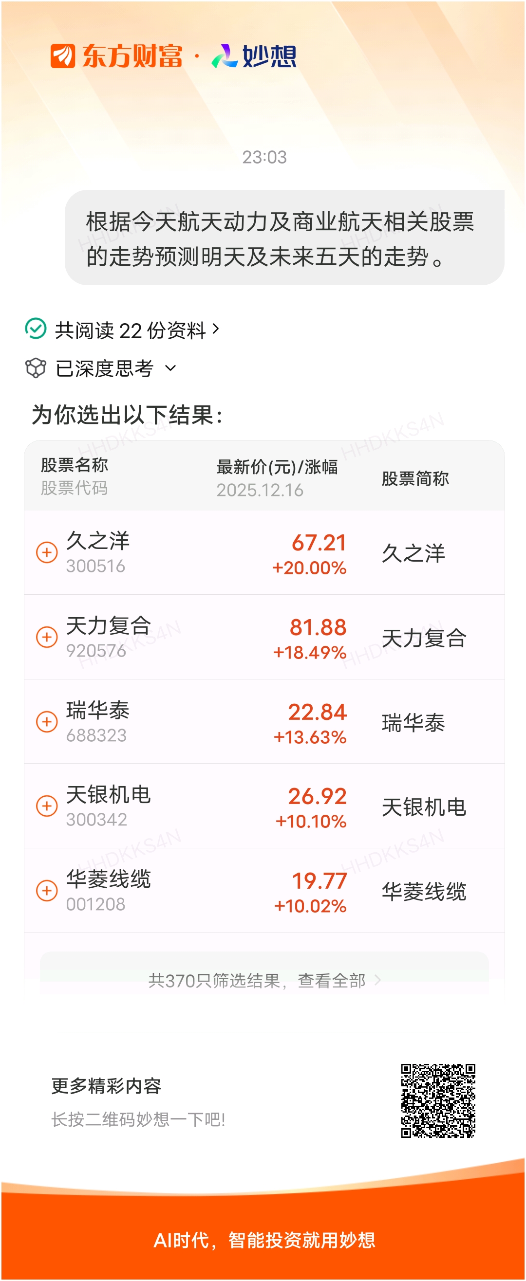 #@妙想,你怎么看?# 妙想一下:根据今天航天动力及商业航天相关股票的走势预测明天及未来五天的走势。