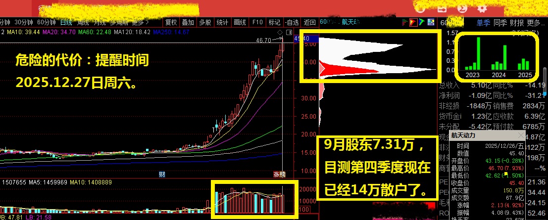 看最下面成交量的黄色条形区域,也就是从202.11.17至今累计换手率598%,一个月时间哟。也 就是散户全部都框进来,怎么宰,未知。建议散户可以减仓撤退法了,下周一开始减仓撤退法,不要再贪婪,也许还会继续涨2个板,游资方便撤退。有的人就撕得更惨了,不信算了。