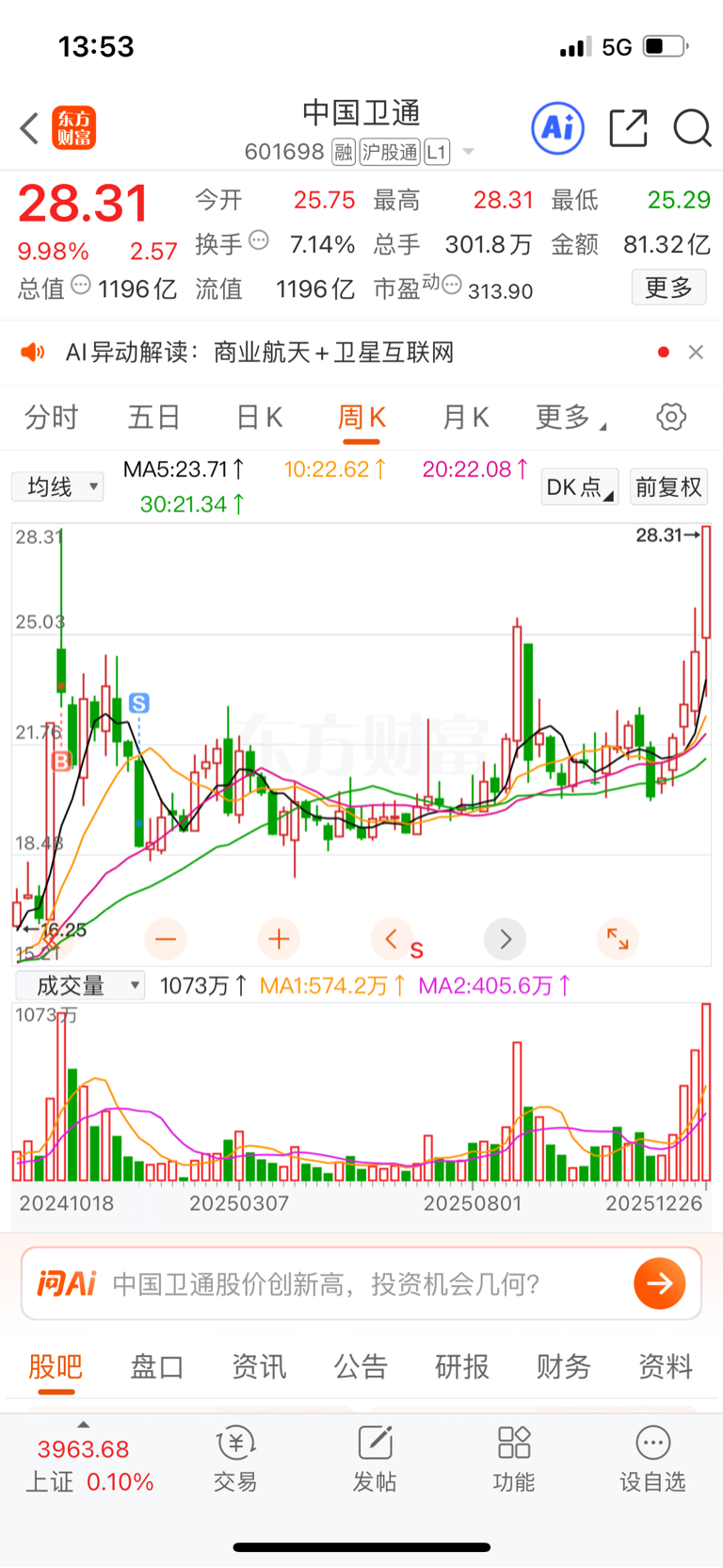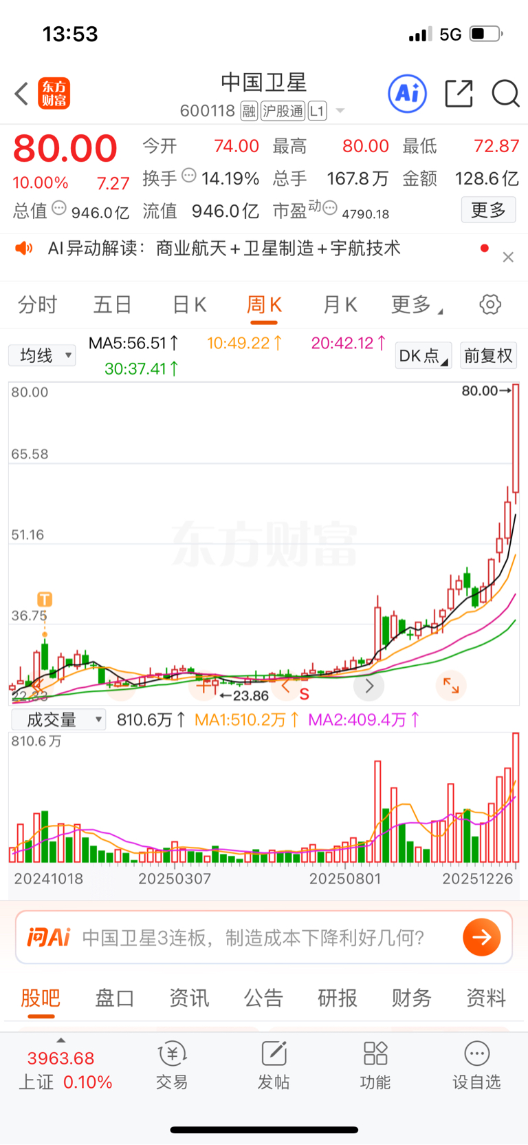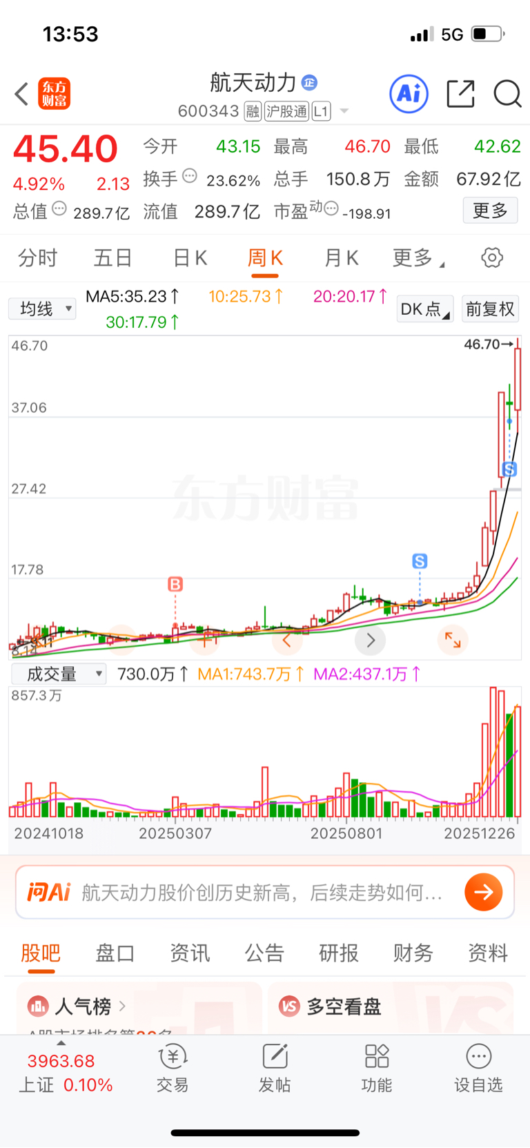 $航天动力(SH600343)$ 唉,虽然还剩一半的动力利润也有百分之200多,但是回想这次的航天,其实做的还是挺失败的,没有及时的把别的暂时没涨的股切换到低位航天股,毕竟当初选的真的不少,现在也都涨起来!下次如果还能遇到这样的大趋势,后排股也一定要好好考虑!