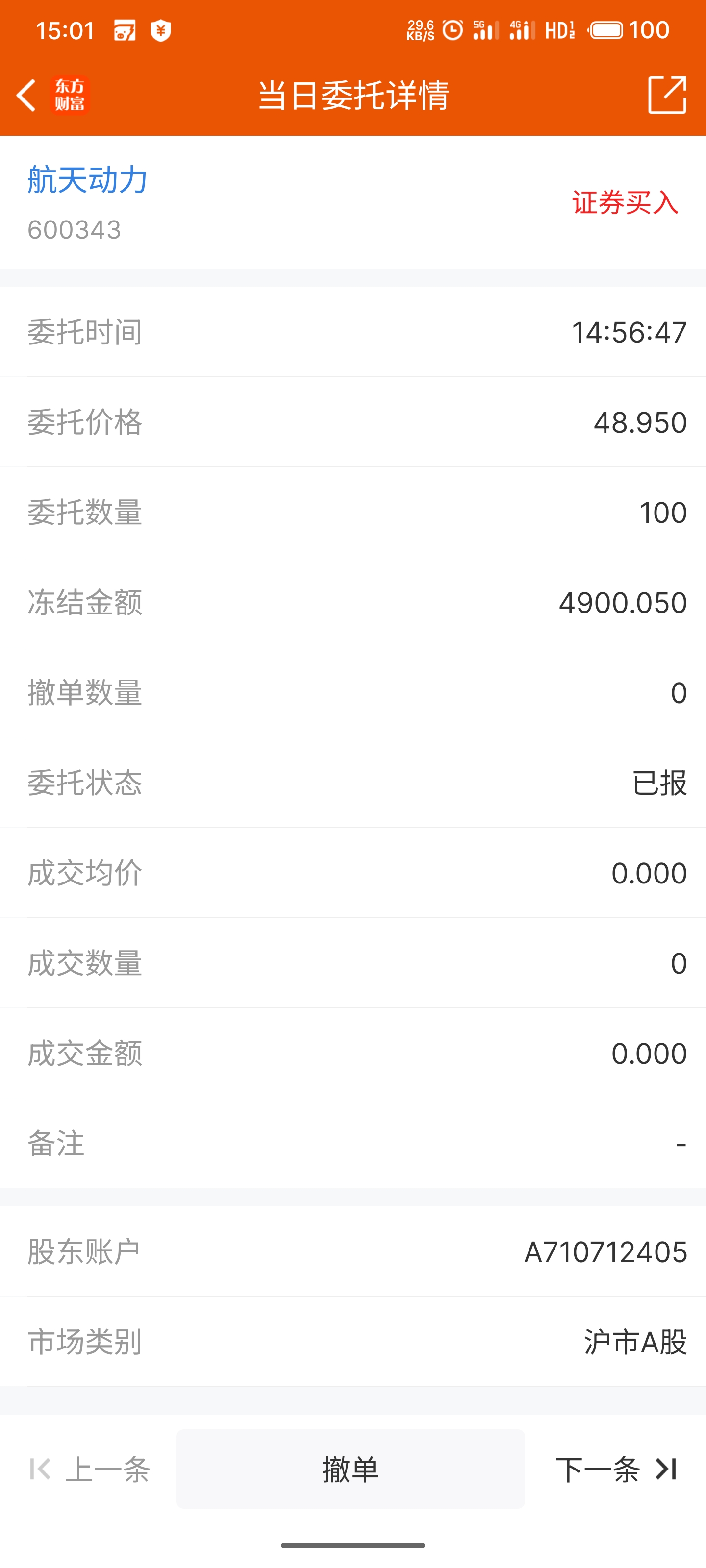 $航天动力(SH600343)$ 压了一天一股没买,尾盘就委托了48.95,1手没成交,哎可惜了,差一点压住啊