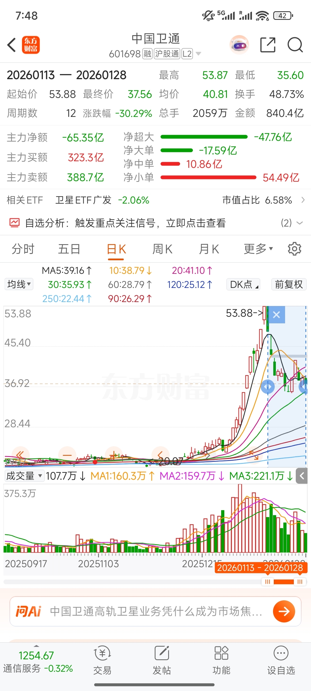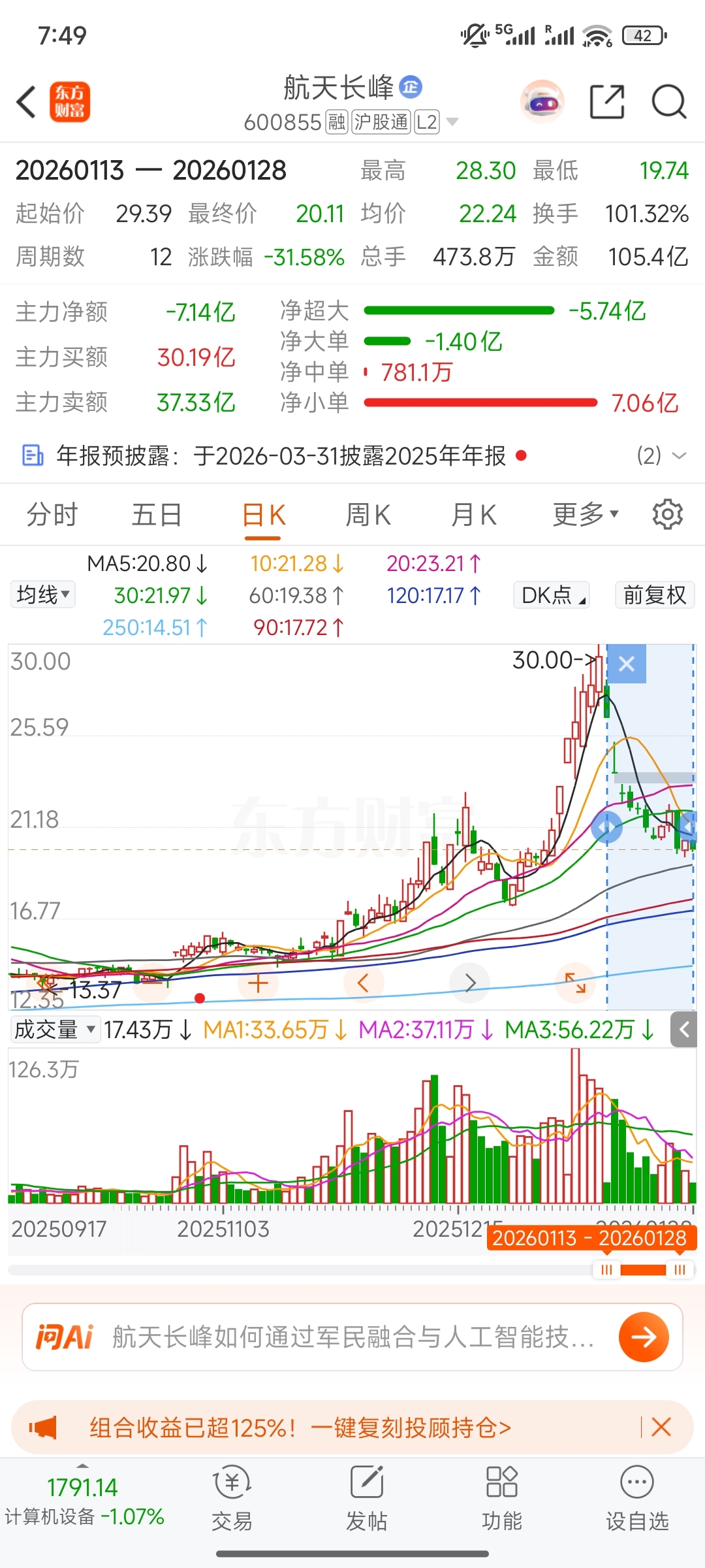 可以发现,列出标的,有6家回调超30%,其中航天机电,航天发展,航天长峰为三家回调前三名,回调最多,航天电子回调最少,为13.34%。