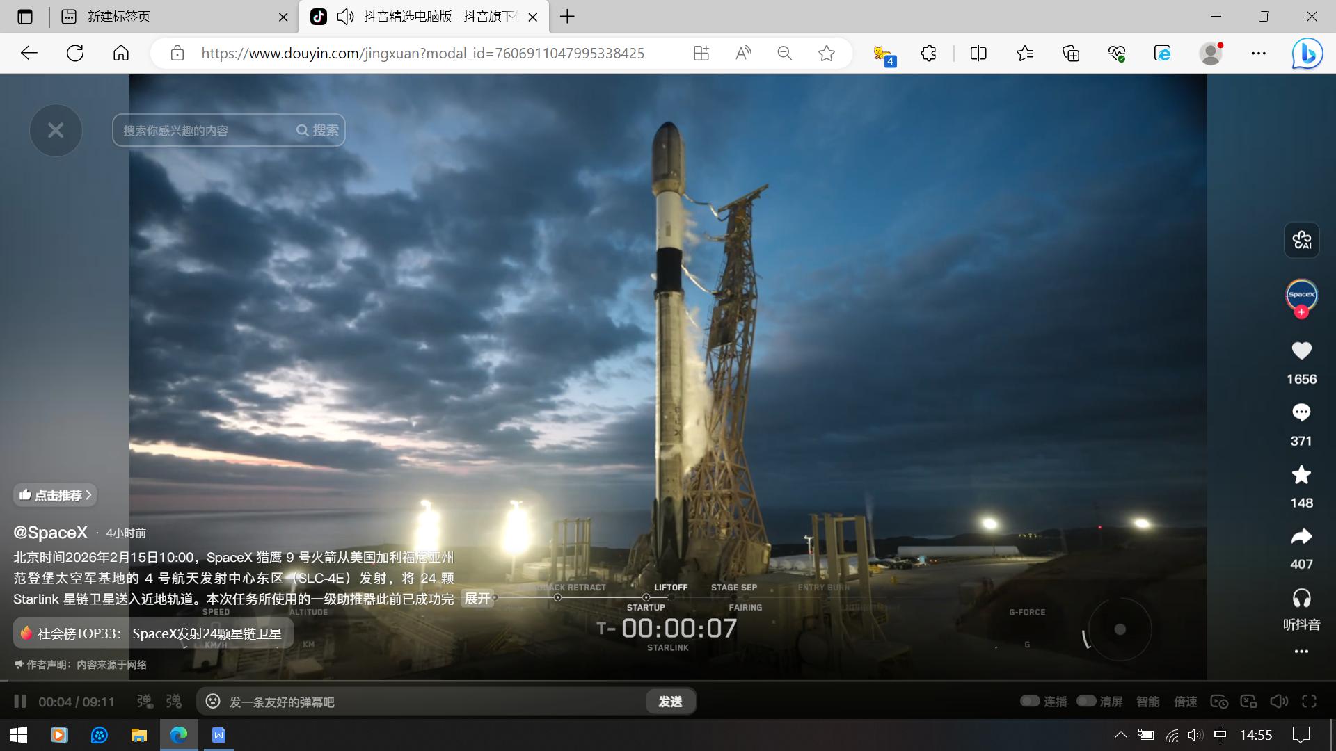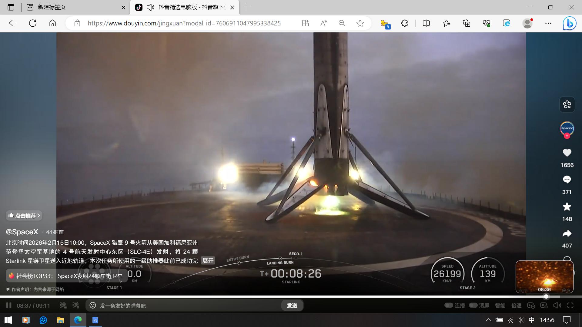 北京时间2026年2月15日10:00,SpaceX猎鹰9号火箭从美国加利福尼亚