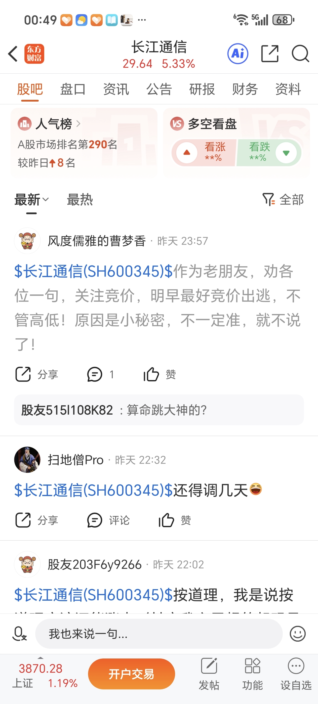 昨晚我说长江的老友也要竞价出逃,不管高低,说我神棍,我把删帖了,拭目以待吧!