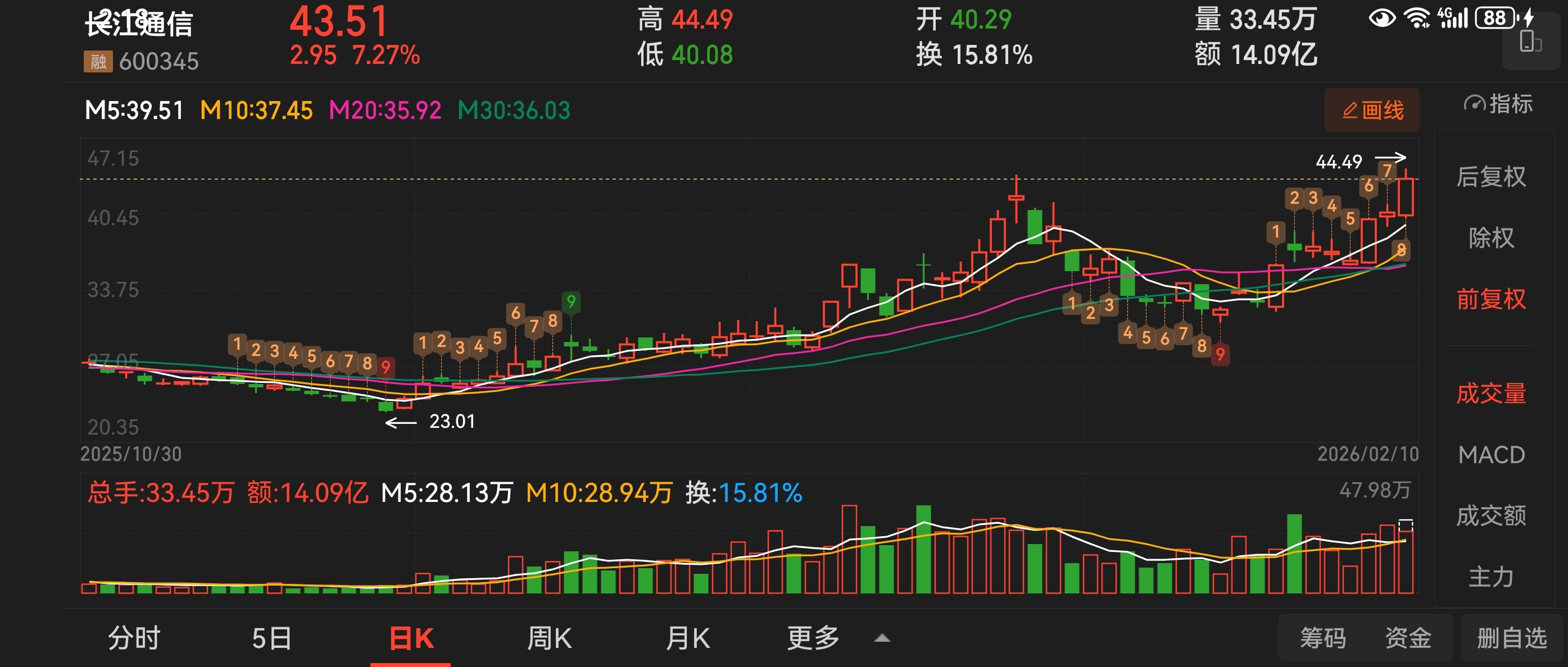 $长江通信(SH600345)$ 2.2号分享的长江通信,到现在接近两板了,注意了!短线的可以先撤了