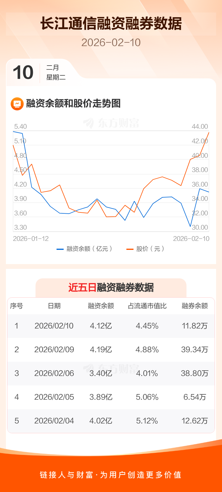 交易所最新数据显示,长江通信于2026年2月10日获融资买入1.67亿元,融资偿还1.74亿元,当日融资净偿还716.19万元。目前,该股融资余额4.12亿,占流通市值比例为4.45%。