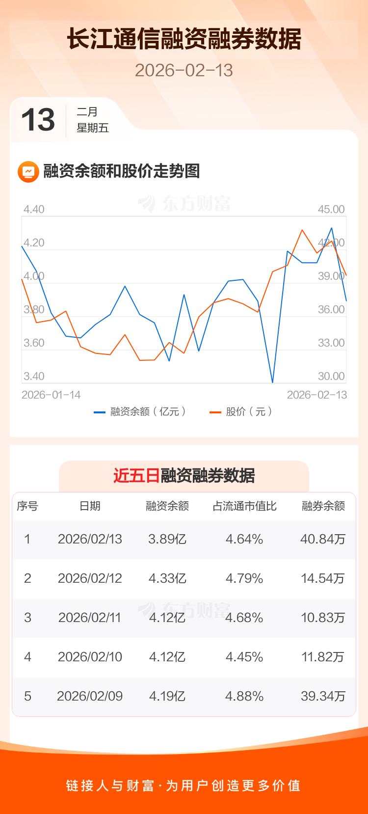 交易所最新数据显示,长江通信于2026年2月13日获融资买入8488.20万元,融资偿还1.29亿元,当日融资净偿还4397.55万元。目前,该股融资余额3.89亿,占流通市值比例为4.64%。