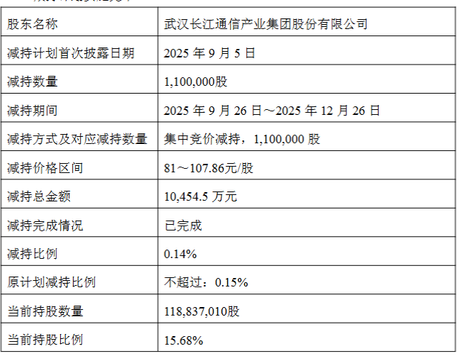 2025年9月~12月,长江通信出售长飞光纤110万股股票,减持价格81元/股至107.86元/股,交易金额达1.05亿元。