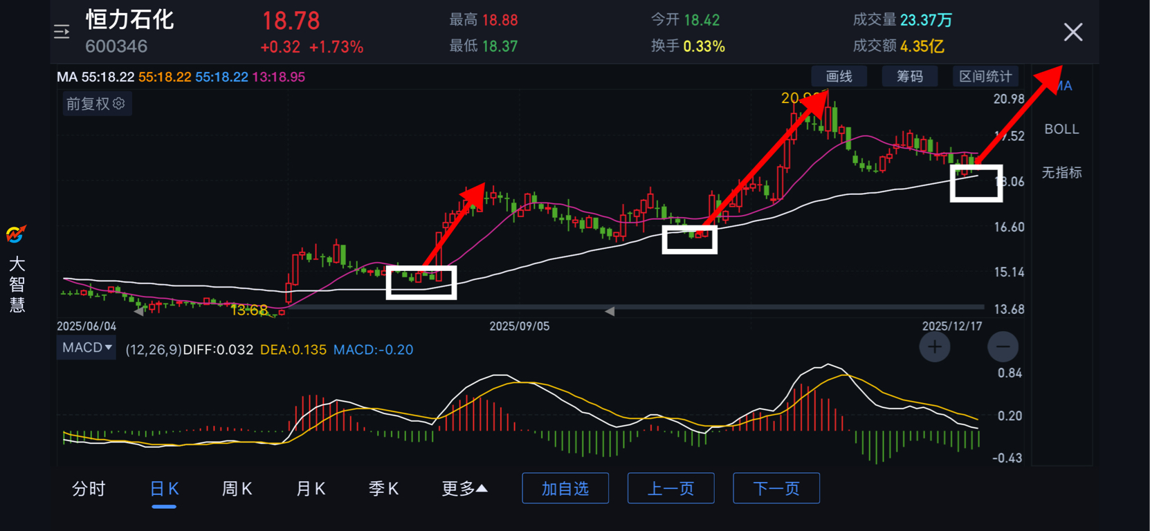 最近恒力石化走势很有规律,每次回调触及均线,DIF接近或穿0轴,都能拉升一波,然