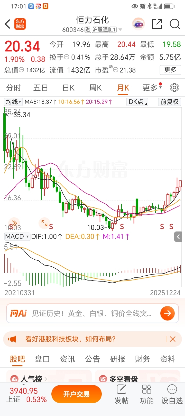$恒力石化(SH600346)$ 月K线大圆底,慢牛行情