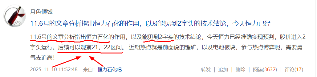 来看恒力石化的全盘技术分析:11.6号指出恒力石化权重占比大,大资金既可以用它拉抬指数,也可以用它稳定大盘。明确指出能见到2字头,11.10号再次说恒力后续可以观察21,22价格区间。