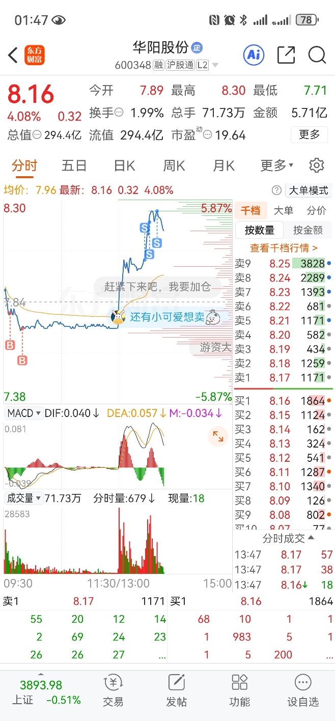 $华阳股份(SH600348)$ 嗯,做了个日内,挣了个盒饭