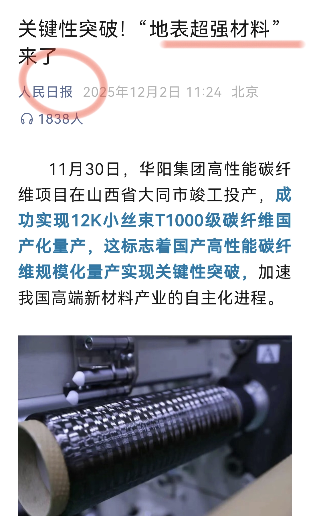 R民日报隆重宣布:华阳股份的T1000碳纤维横空出世,国内大飞机、商业航天器等高