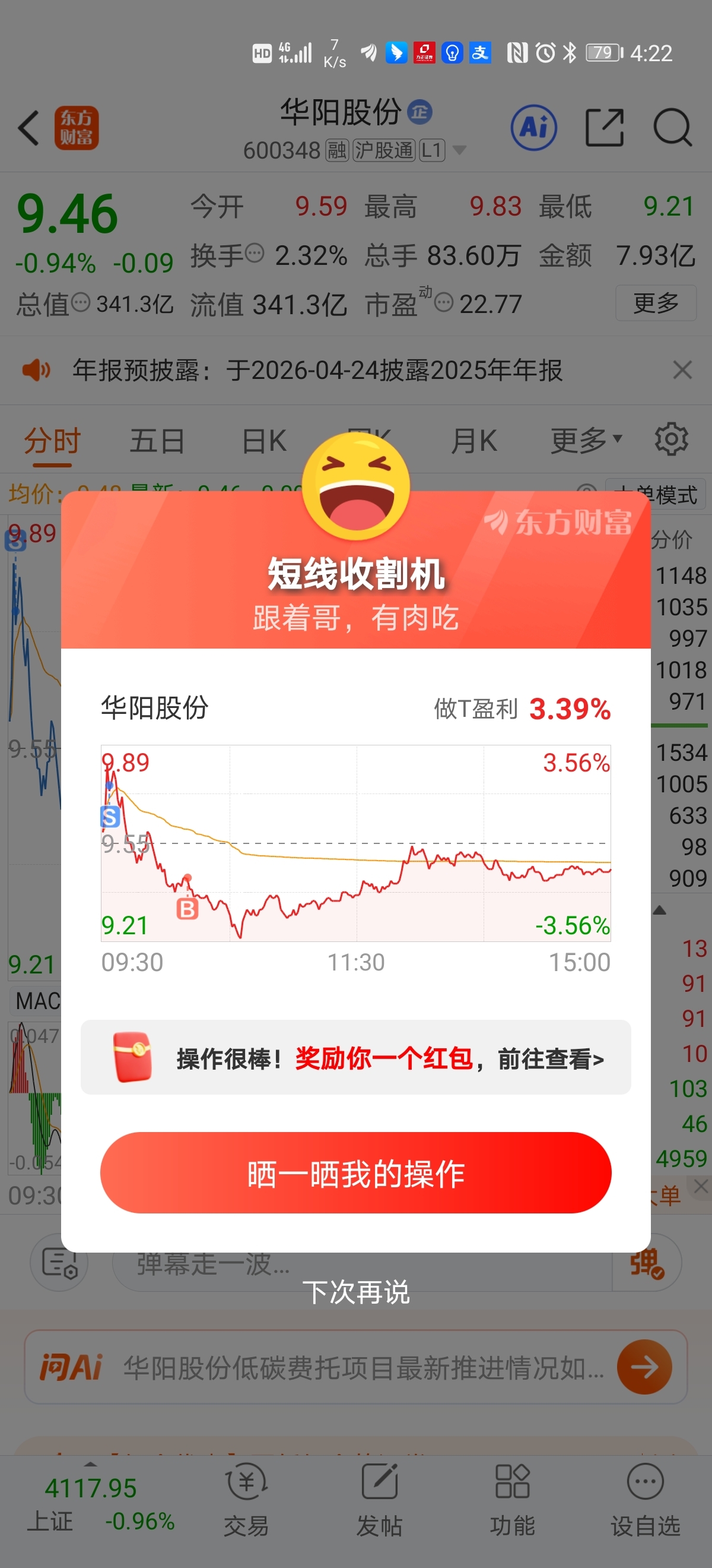 $华阳股份(SH600348)$ 二大码又来了哈,超短富一代,不动死一代。大码,一起来弄短差哈,每次俩三个点,十次就二三十个点,明码标价,明着干,一个月干他个七八次,复利是很厉害的哦。