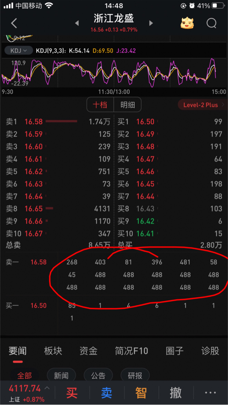 16.58的1.74万手卖单,全都是488一组,量化呀