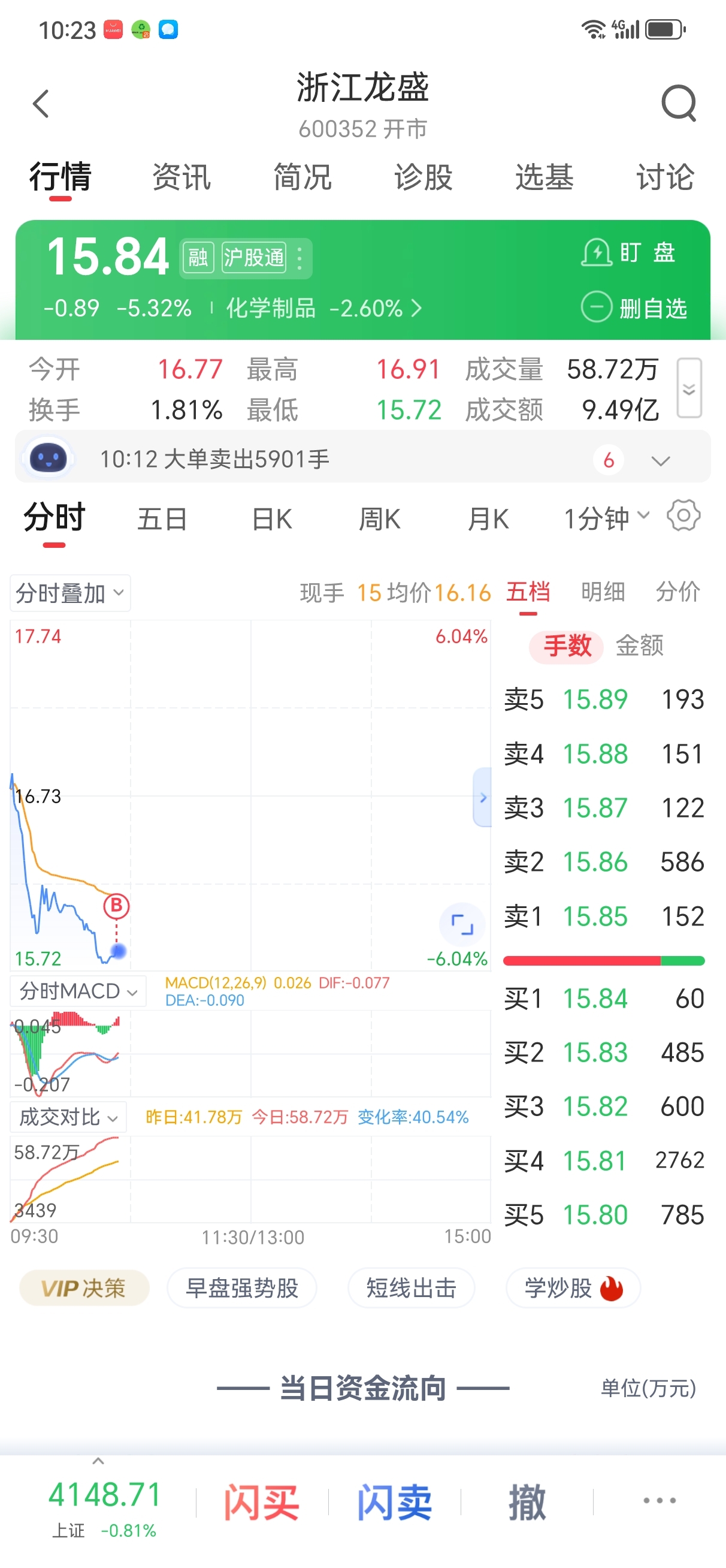 $浙江龙盛(SH600352)$ 昨天做了一个五个点的T,今天还给机会啵,底我算是抄了