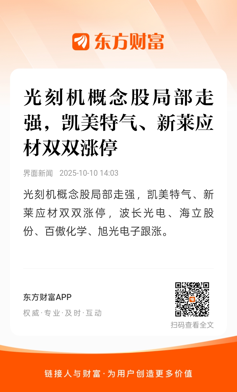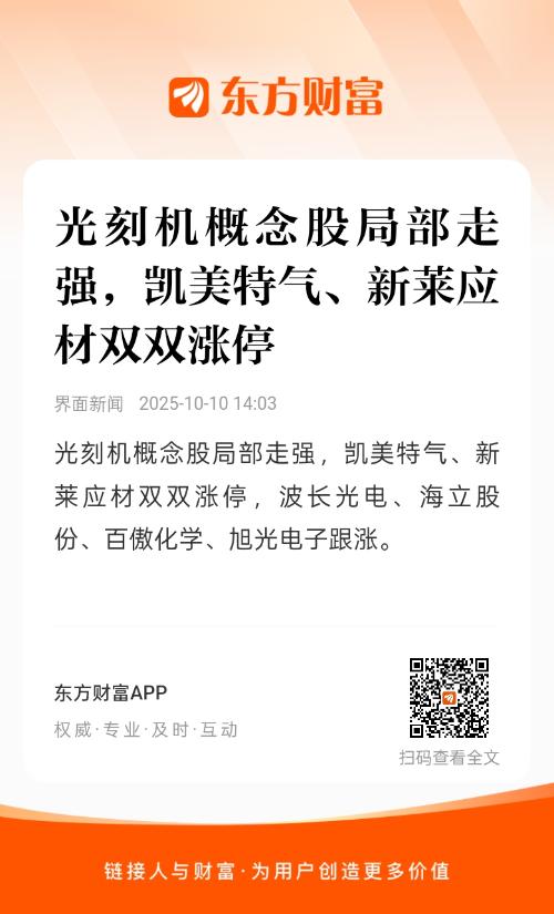 光刻机概念股局部走强,凯美特气、新莱应材双双涨停,波长光电、海立股份、百傲化学、旭光电子跟涨。