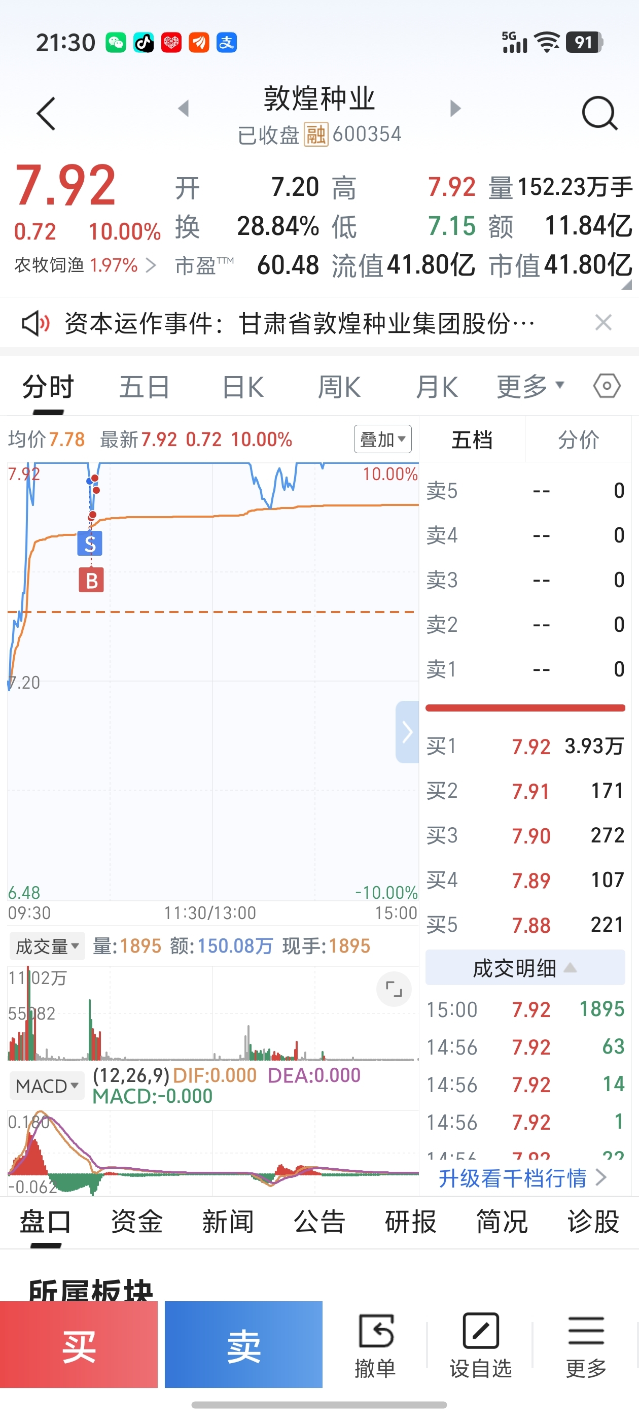 $敦煌种业(SH600354)$ 勉勉强强吧,终于体会到速度的重要性了,不过行情也来的太快了,还要买卖其他股票倒仓,所以做t价位不太理想