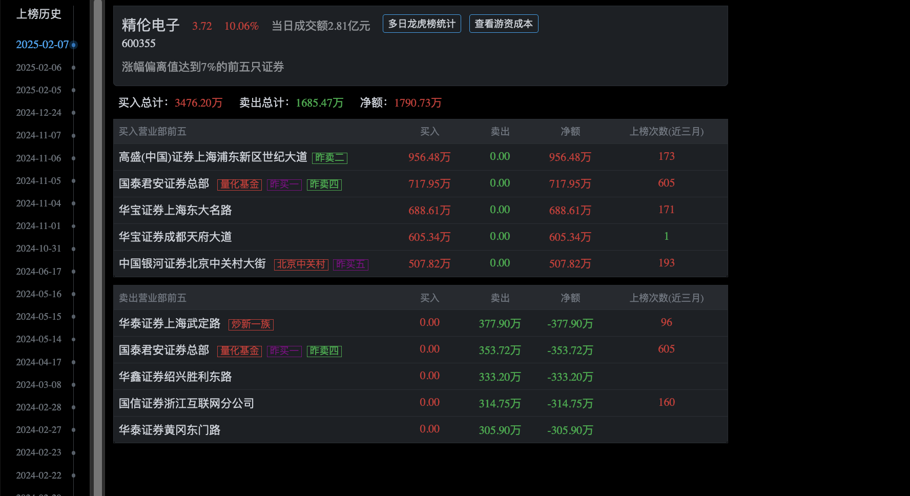 精伦电子今日游资龙虎榜席位上榜数据如下!