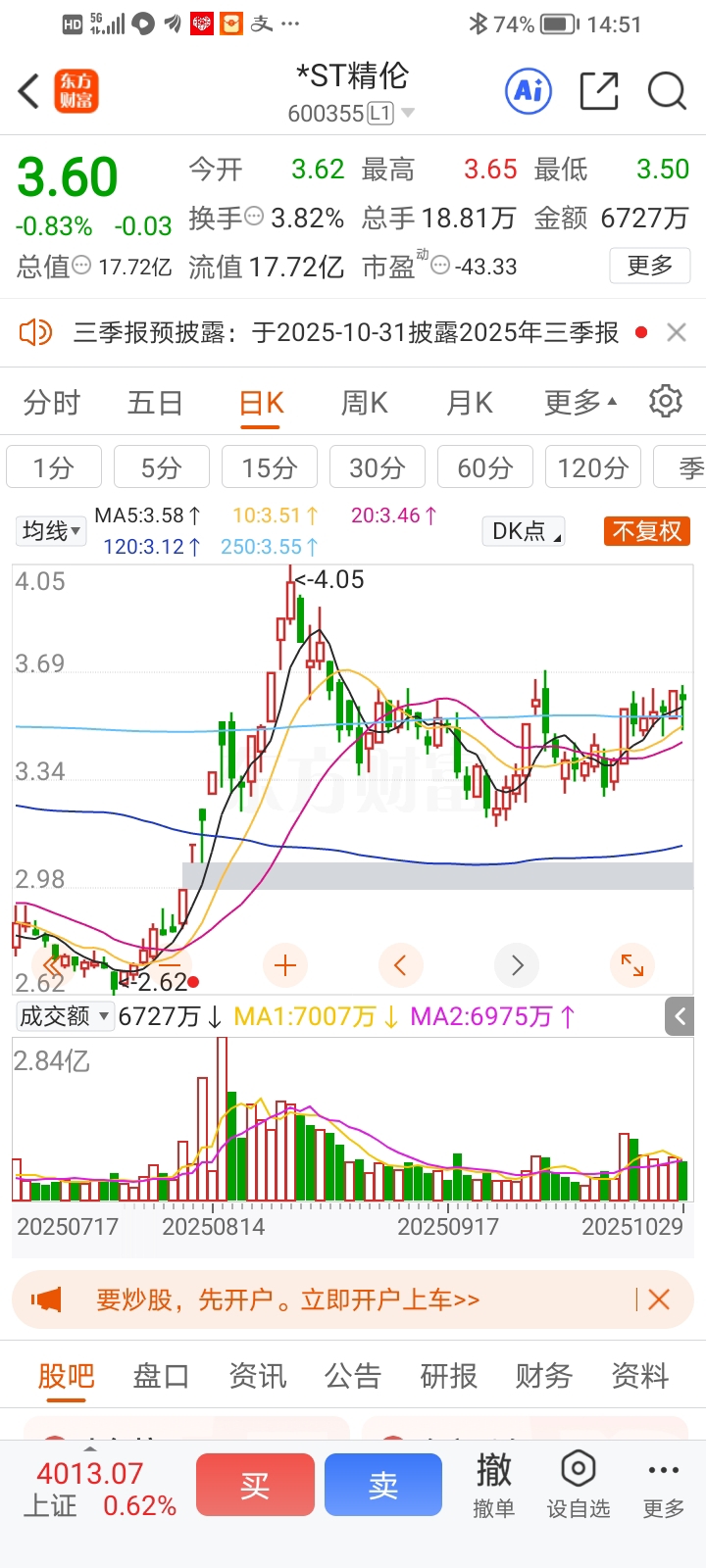 $*ST精伦(SH600355)$ 三季报马上出炉!