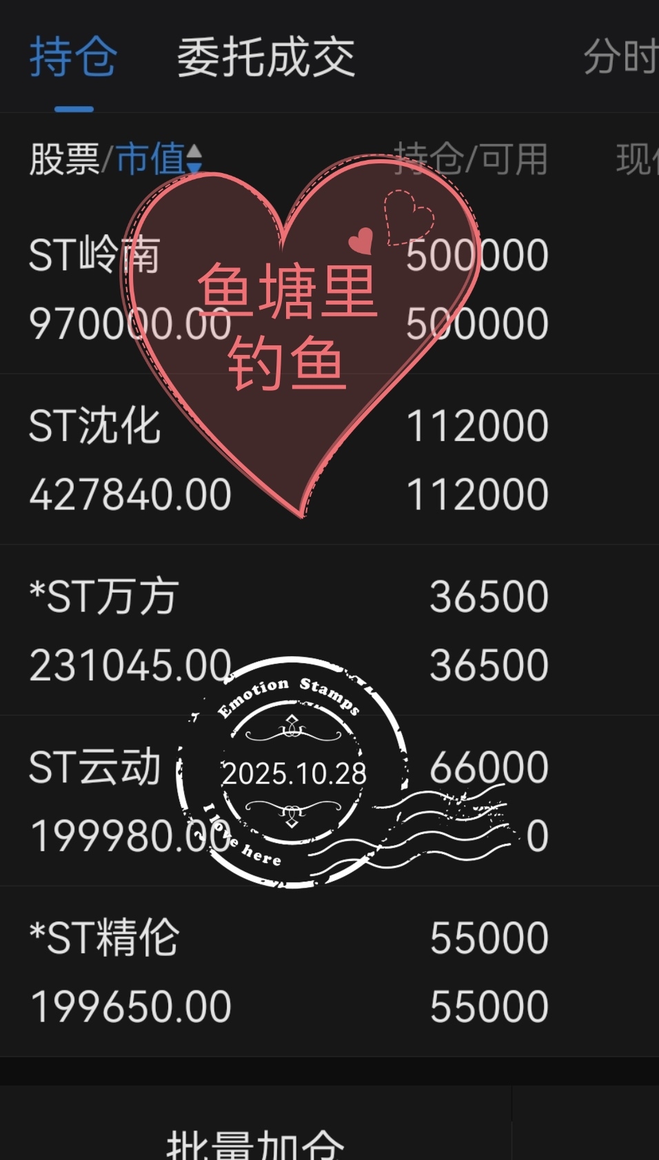 当日持仓:持仓5支9.5层仓,分别为*ST岭南4.5层仓、ST沈化2层仓、*ST万方1层仓、*ST精伦1层仓、ST云动1层仓