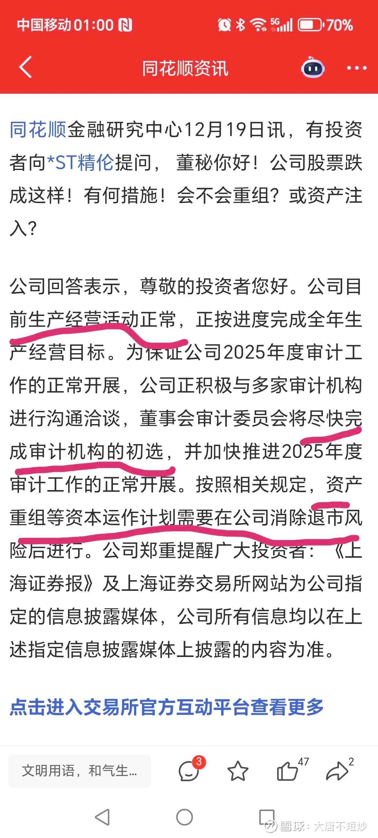 $*ST精伦(SH600355)$ 市值不到10亿,3亿收入问题不大,公司也在积极主动回答,聘请审计机构,出最终结果也是4月份,下周一开干