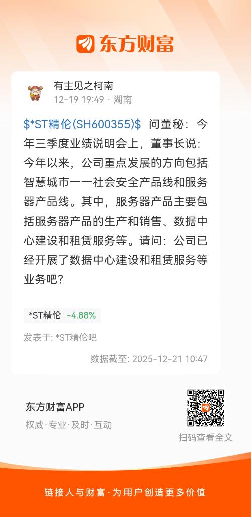 $*ST精伦(SH600355)$ 问董秘:今年三季度业绩说明会上,董事长说:今年以来,公司重点发展的方向包括智慧城市一一社会安全产品线和服务器产品线。其中,服务器产品主要包括服务器产品的生产和销售、数据中心建设和租赁服务等。请问:公司已经开展了数据中心建设和租赁服务等业务吧?