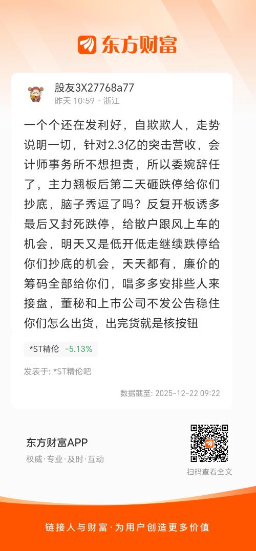 一个个还在发利好,自欺欺人,走势说明一切,针对2.3亿的突击营收,会计师事务所不想担责,所以委婉辞任了,主力翘板后第二天砸跌停给你们抄底,脑子秀逗了吗?反复开板诱多最后又封死跌停,给散户跟风上车的机会,明天又是低开低走继续跌停给你们抄底的机会,天天都有,廉价的筹码全部给你们,唱多多安排些人来接盘,董秘和上市公司不发公告稳住你们怎么出货,出完货就是核按钮