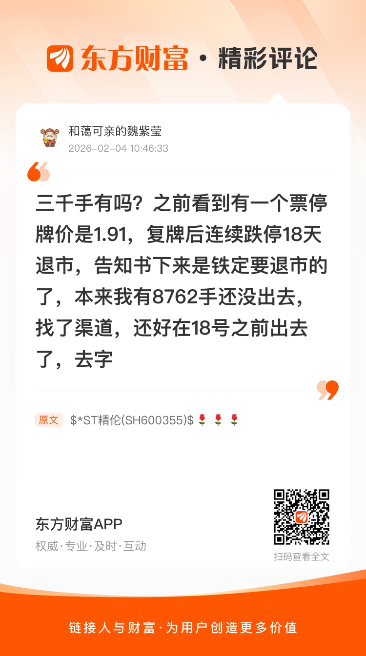 快下车//@和蔼可亲的魏紫莹 : 三千手有吗?之前看到有一个票停牌价是1.91,复牌后连续跌停18天退市,告知书下来是铁定要退市的了,本来我有8762手还没出去,找了渠道,还好在18号之前出去了,去字