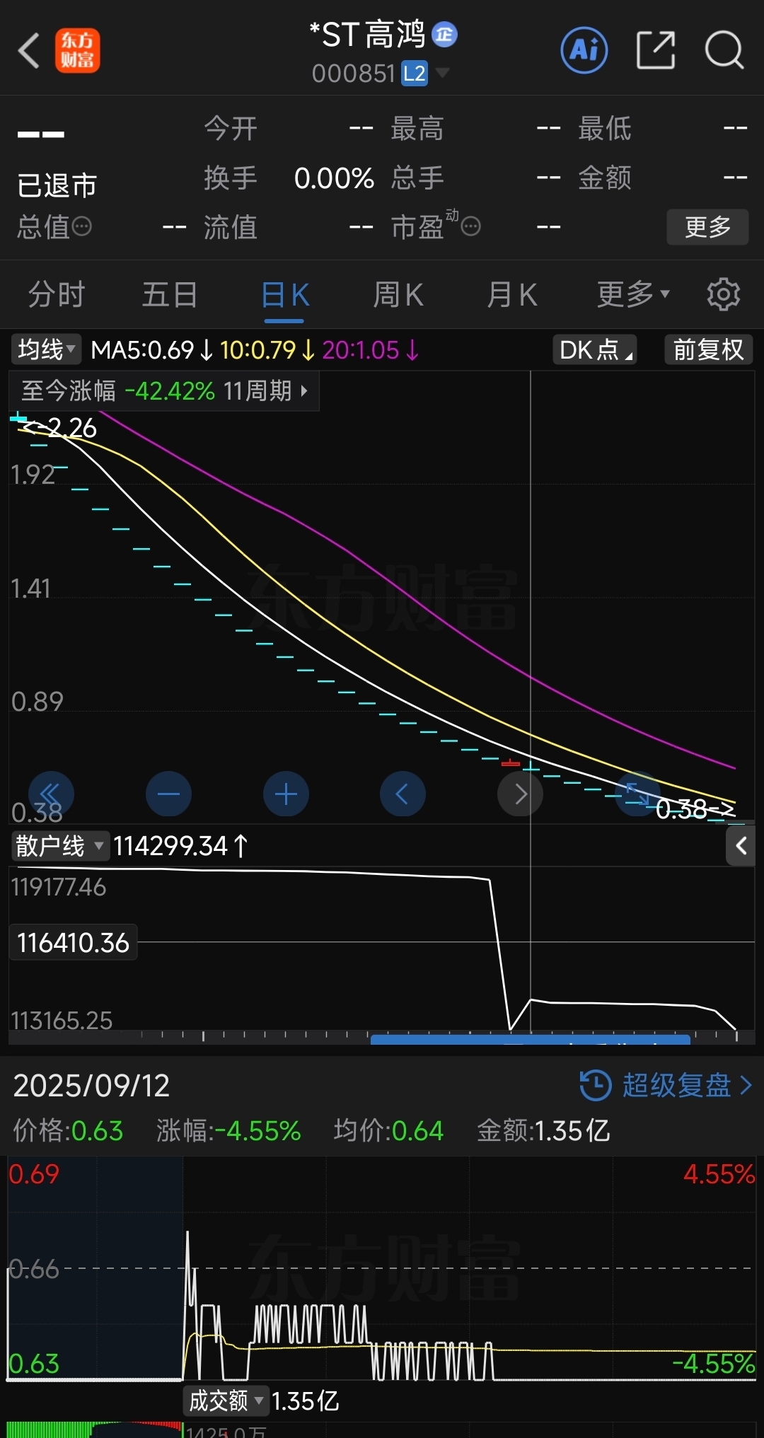 精伦的走势就是高鸿的走势,为数不多翘班后依旧地板,后面连续跌停到退市。