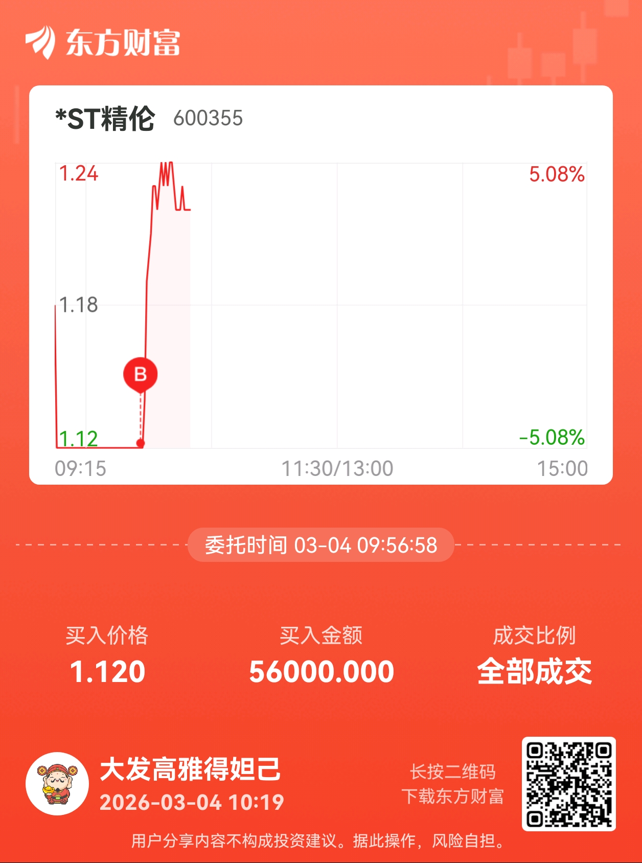 温馨提示: 1.根据《证券法》规定,禁止编造、传播虚假信息或者误导性信息,扰乱证券市场;2.用户在本社区发表的所有资料、言论等仅代表个人观点,与本网站立场无关,不对您构成任何投资建议。用户应基于自己的独立判断,自行决定证券投资并承担相应风险。《东方财富社区管理规定》