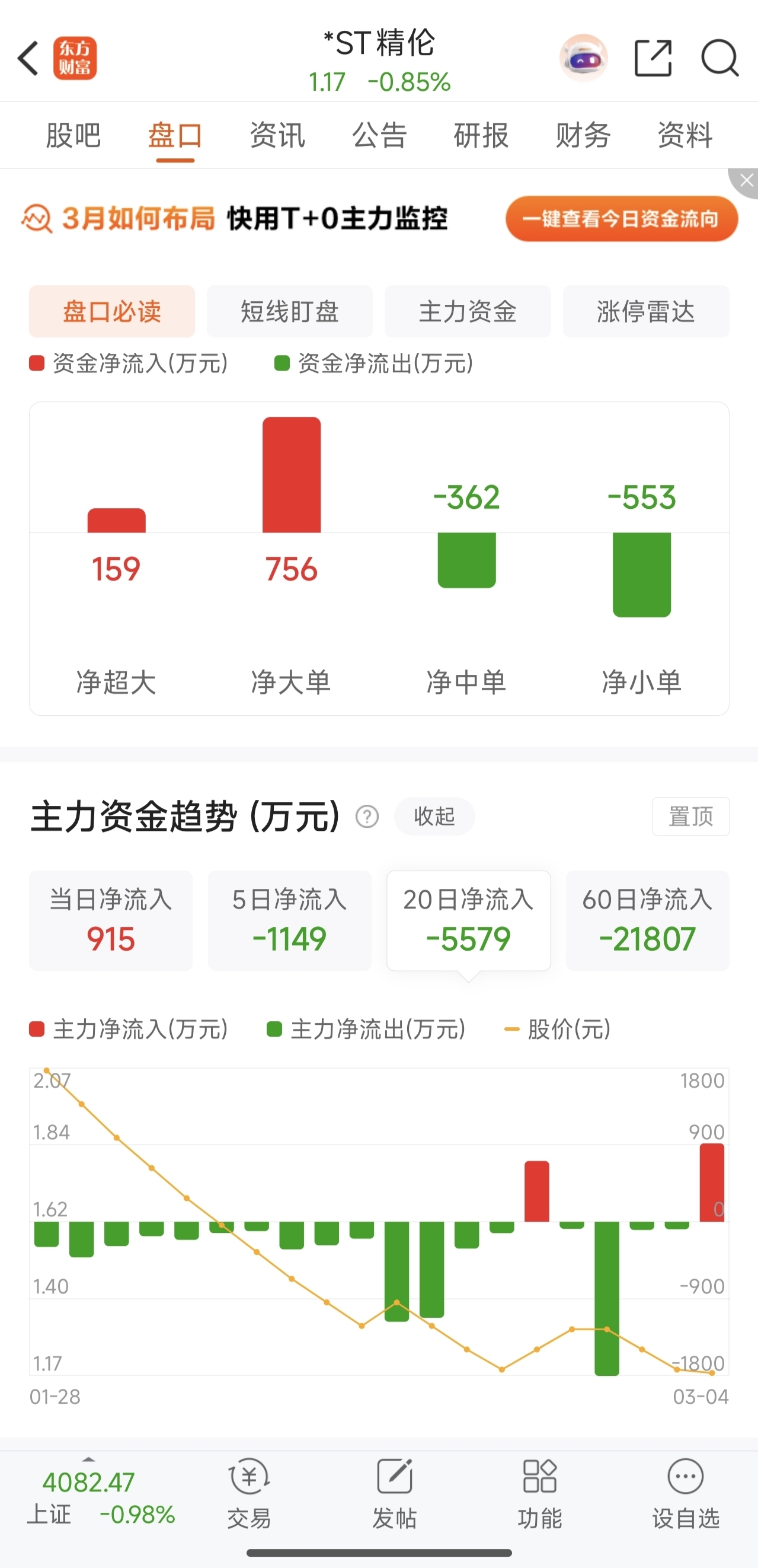 $*ST精伦(SH600355)$ 今天吃货很猛,比上次地天板流入的还多,上次1.12反弹到1.37,这次又是1.12开板,盘中地天尾盘回落是为了吃到更多筹码,这波反弹估计会比上一波更猛,可能会摸一下1.5,要不主力进这么多图啥?这股总营收3.38亿,是末日轮票中唯一能讲故事的,也是两市股价最低的
