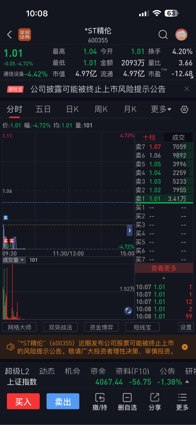 $*ST精伦(SH600355)$ 主力你们悠着点,本人今天T了你半仓略微加仓,重仓买指数去了,指数赚他点再来支持你。可惜今天万方没有地天,要不然你也要红。