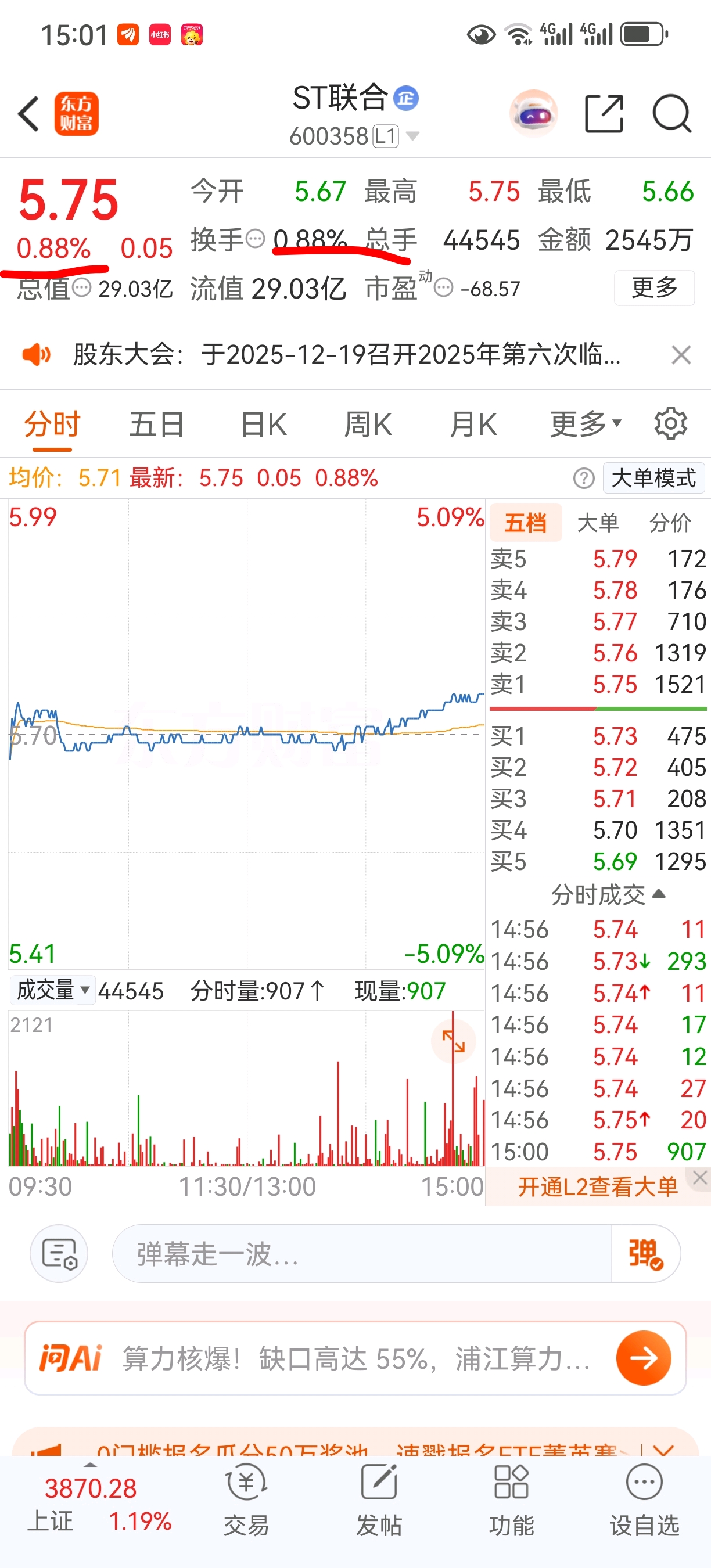 $ST联合(SH600358)$ 换手0.88涨幅0.88主力暗语来了