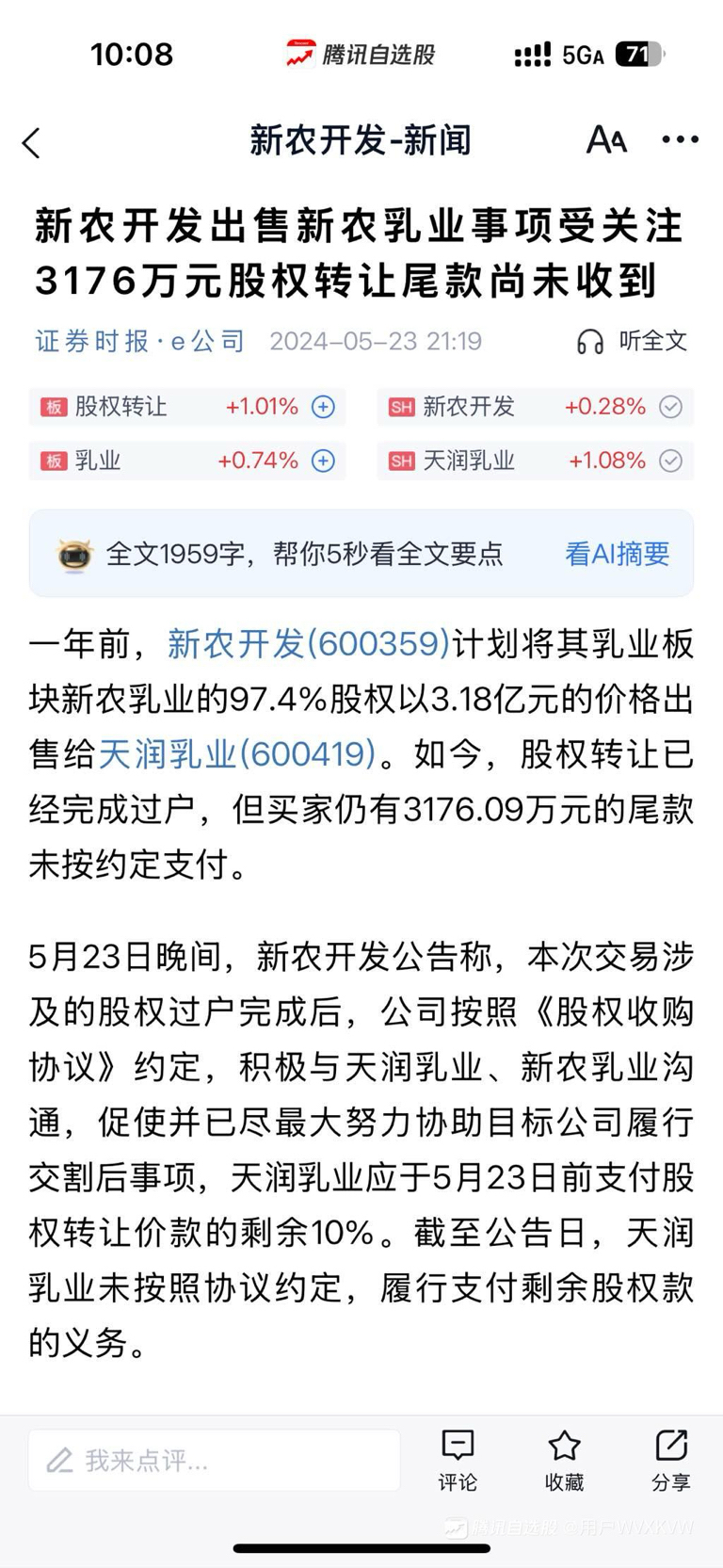 $新农开发(SH600359)$ 这种国资背景的上市公司,出售资产几年了,还收不到钱,现在控股股东转给子公司了,会记师事务所也换了,那笔钱比公司一年净利润还多,现在直接不了了之了,炒股十几年,闻所未闻,中国上市公司牛逼,