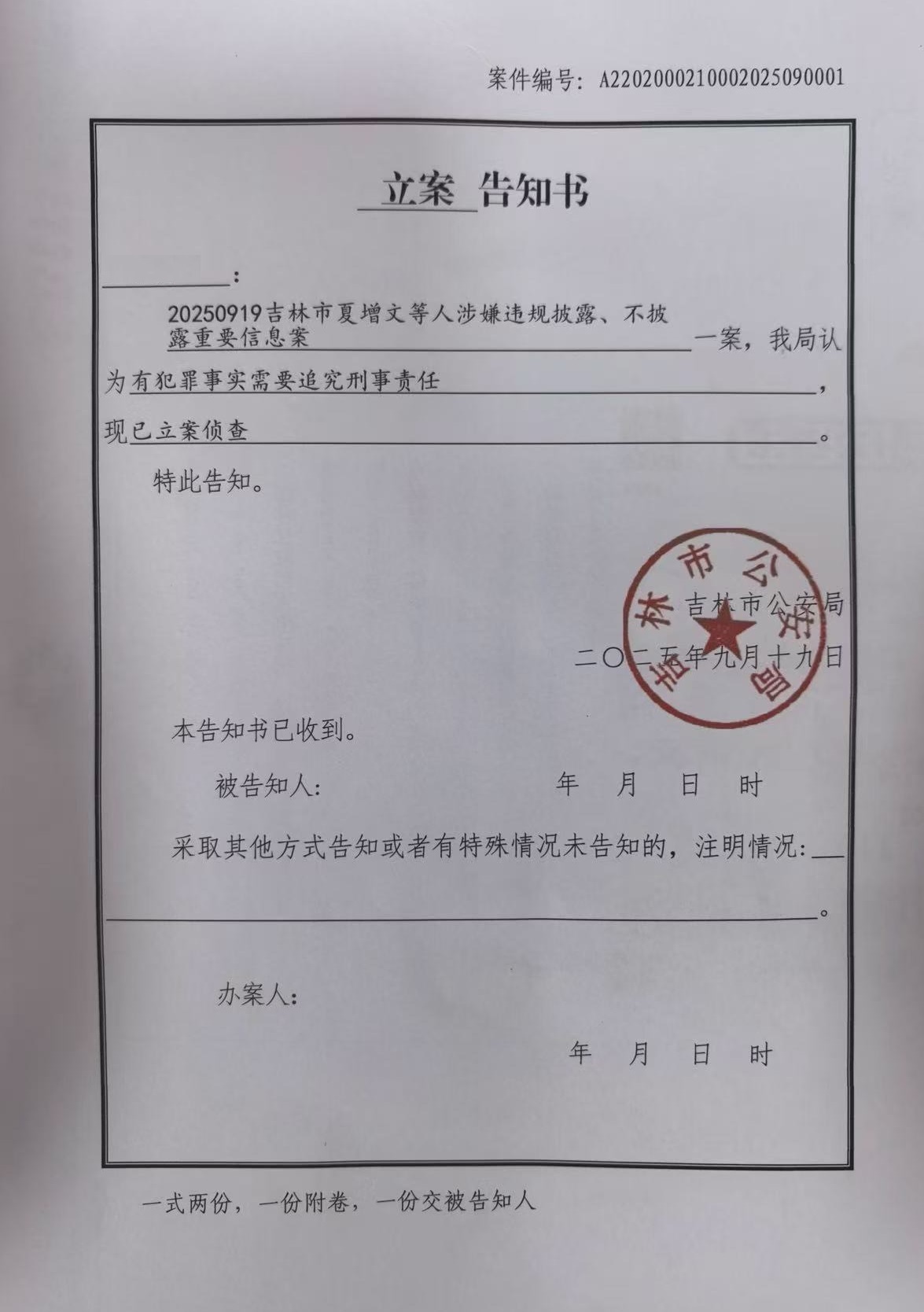 实际上,吉林市警方早已接到夏增文涉刑的举报。记者获得的书面材料显示,吉林市公安局在2024年10月14日书面受理针对曾涛、夏增文等人涉嫌职务侵占以及向国家机关工作人员行贿的举报。但本次夏增文被刑事立案,从告知书来看,仅涉及信披违规,并未提到警方较早前受理的举报内容。